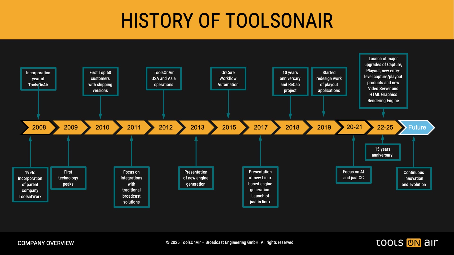 Since 2008, ToolsOnAir has been pioneering the integration of macOS and Linux into professional broadcast environments. Headquartered in Vienna, Austria, we deliver cutting-edge ingest and playout solutions that empower TV stations, production facilities, houses of worship, government organizations, and educational institutions worldwide. Our customers range from boutique studios to major broadcasters.