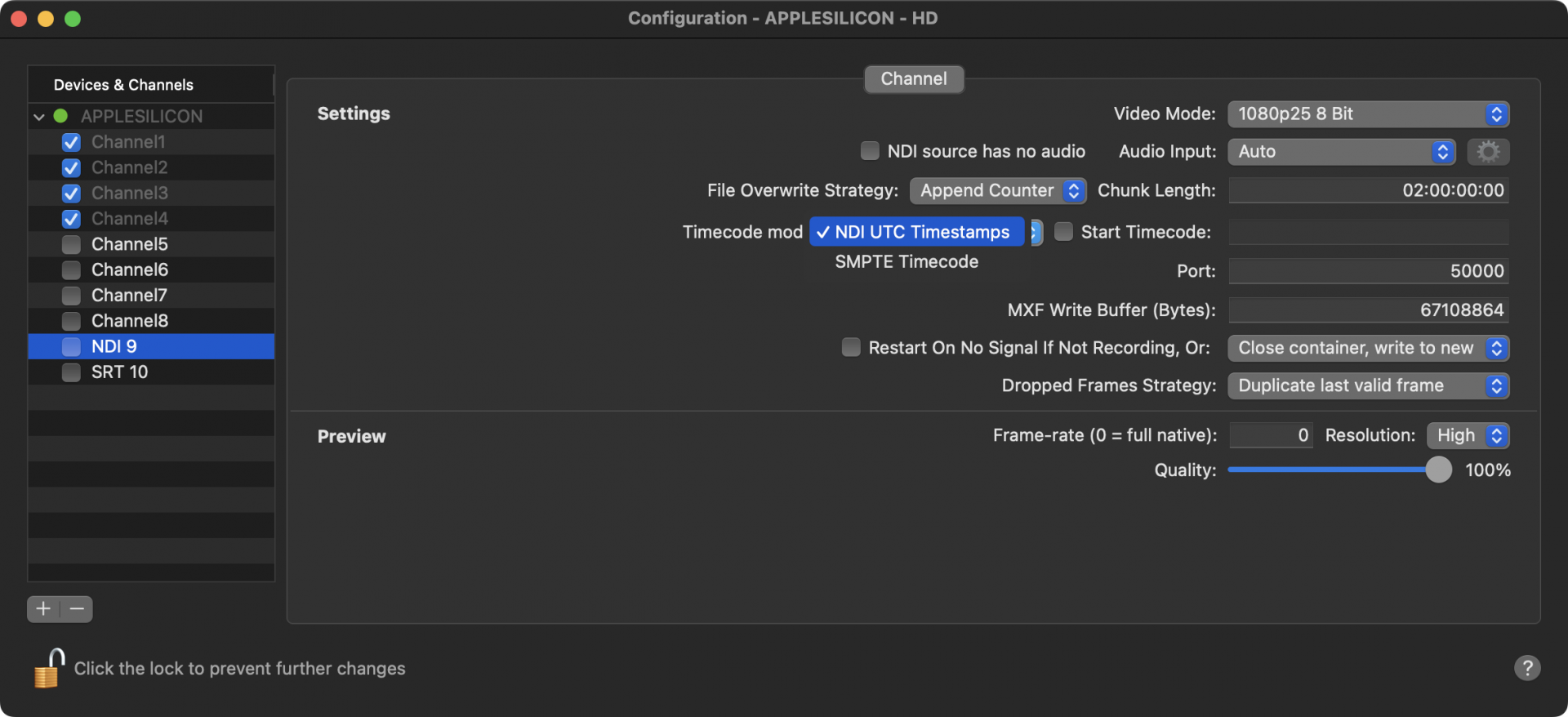 NDI channels now have an additional “Timecode mode” settings with the options “NDI UTC Timestamps” and “SMPTE Timecode”. The former expects frames with standard NDI UTC timestamps, as provided by the majority of NDI devices. The latter expects SMPTE timecode encoded as 100ths of a nanosecond. This may be useful in conjunction with some devices such as the AJA Bridge that take embedded SDI SMPTE timecode and converts it for use with NDI. When “SMPTE Timecode” is selected for the channel, “SDI Embedded” is additionally available as a timecode source, allowing you to see the embedded timecode sent with the stream.