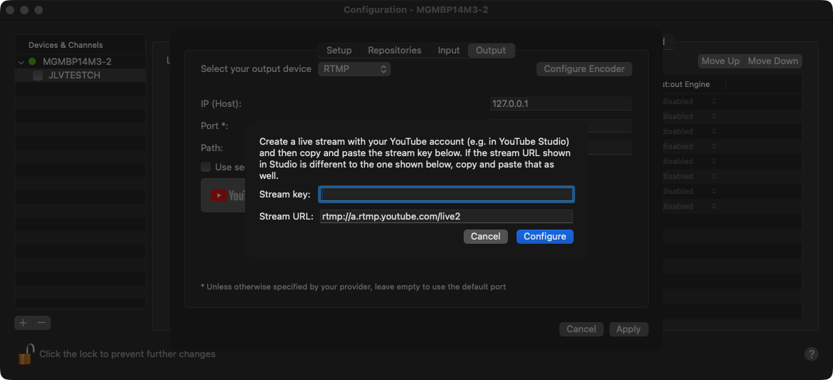 Added an additional option to output RTMP (or RTMPS) for streaming to YouTube, Wowza or other video servers. When configuring the output, there is an additional button for YouTube for quick configuration using the stream ID from YouTube.