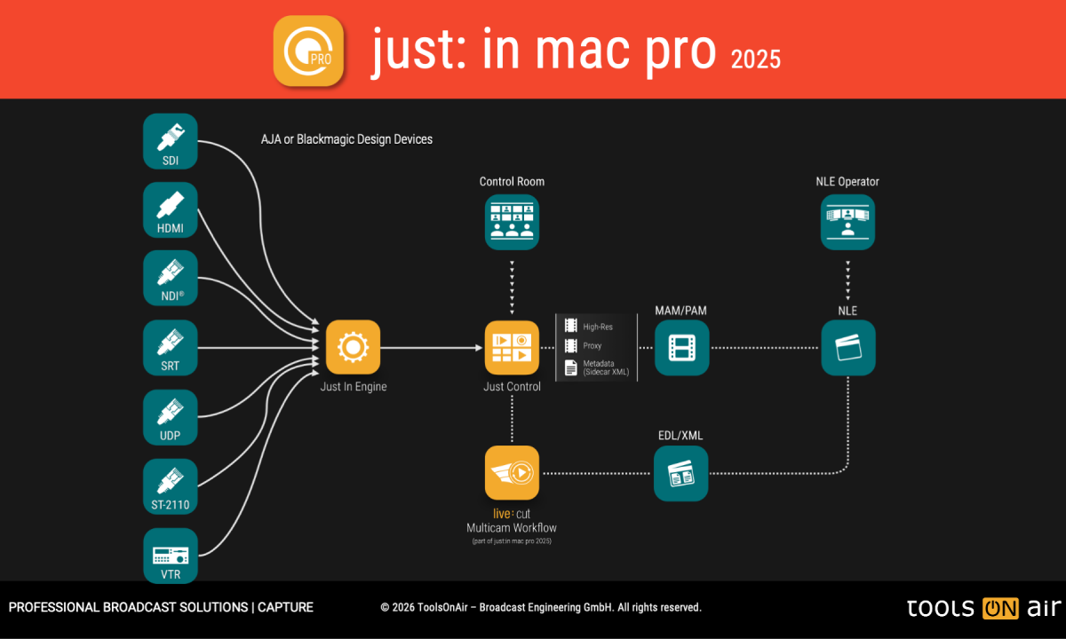 ToolsOnAir Broadcast Engineering GmbH, based in Vienna, Austria, pioneered the concept of "TV station in a Mac" and develops innovative, powerful, and versatile capture, playout and live captions solutions for macOS or Linux platforms.