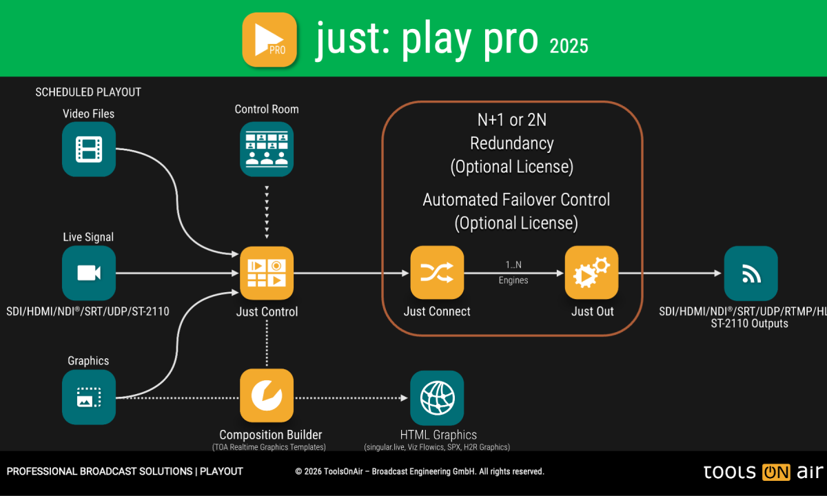 just:play pro 2025 is a Single Channel automated 24/7 Master Control playout solution with SD, HD and UHD format support, seamlessly integrating live feeds and routers as well as GPI events and...