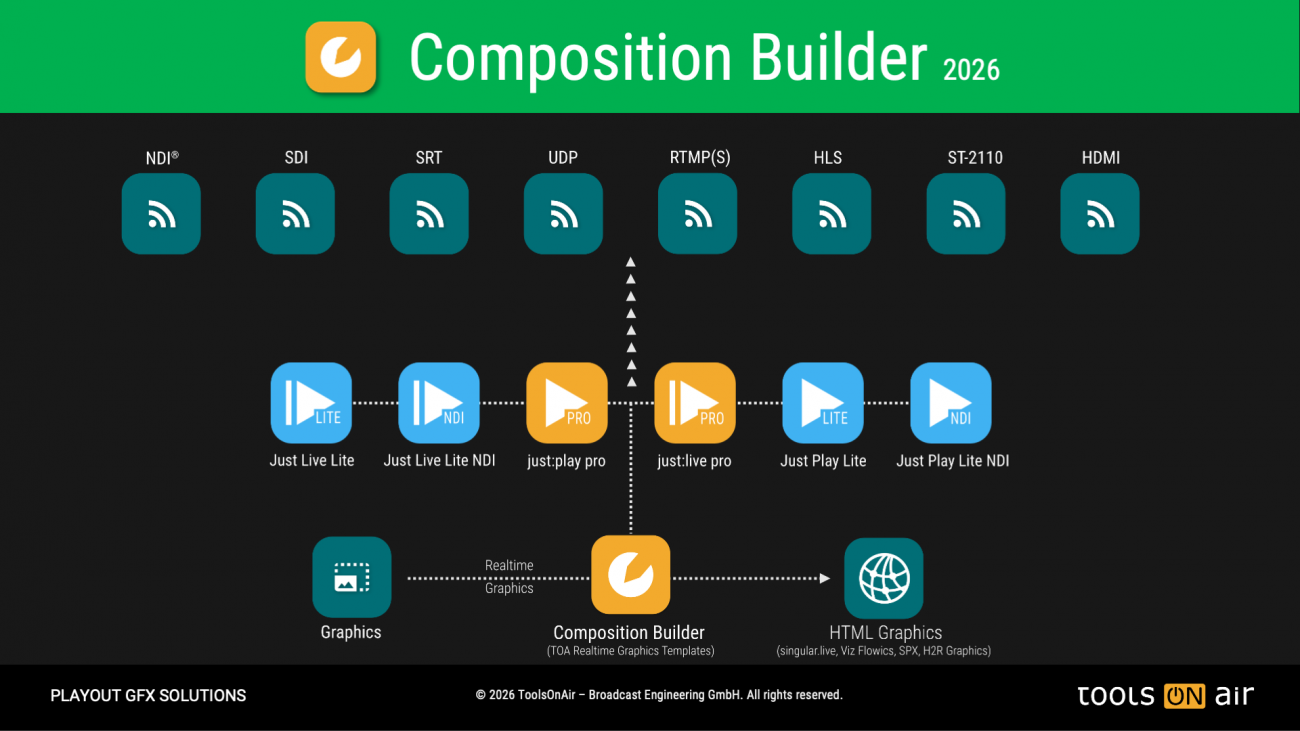 The Composition Builder 2026 application for macOS enables TV stations and Live Event broadcaster to effortlessly create high-quality real-time graphic templates, which can be utilized directly in just:live pro 2026 and just:play pro 2026.