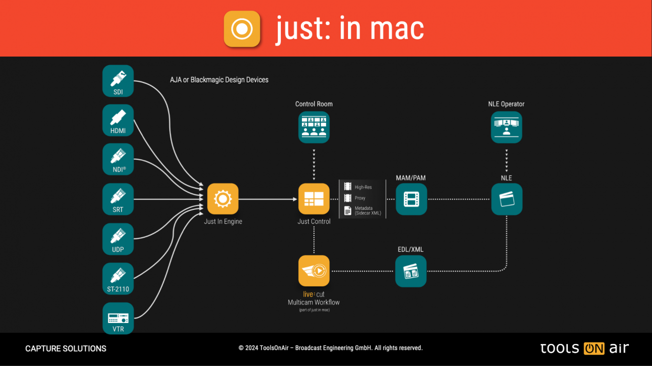 just:in mac is a macOS-based client-server multichannel capture solution to record SDI, HDMI, NDIĀ®, SRT, UDP, ST-2110, VTR and multicamera sources using Crash, Batch, or Schedule recording modes.