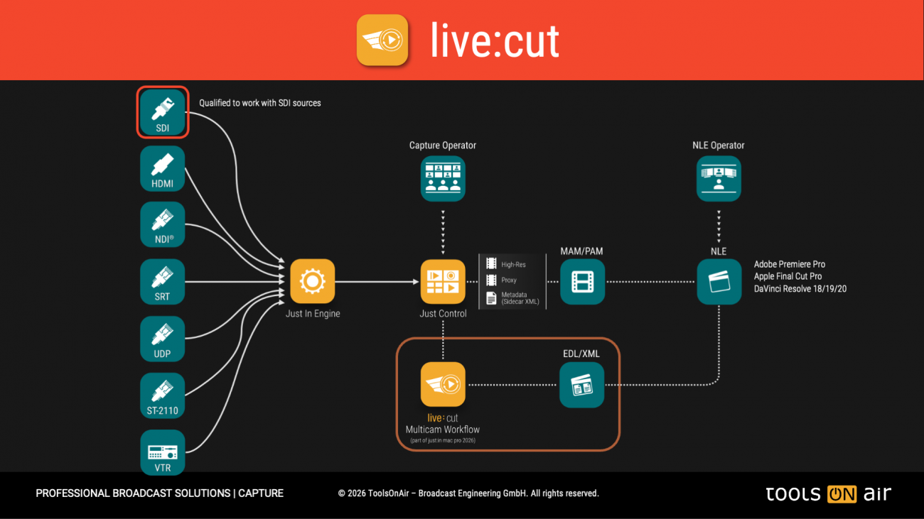 live:cut is an option to just:in mac pro 2025 and enables multicamera production workflows for up to 16 cameras and is designed to improve today's multi-camera productions, dramatically reducing production time by eliminating time-consuming production processes. From talk and game shows to soaps and sitcoms up to live concerts and event recordings, live:cut is a powerful solution for any multicamera production, with production efficiency in mind.