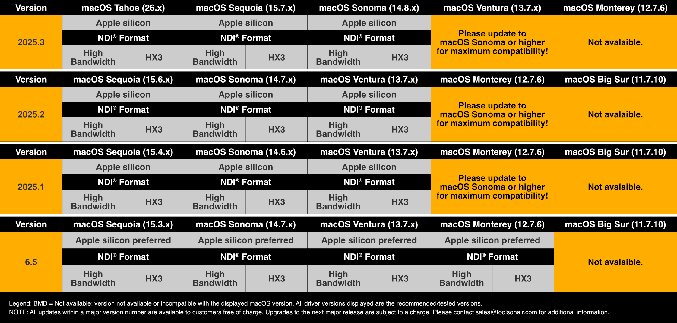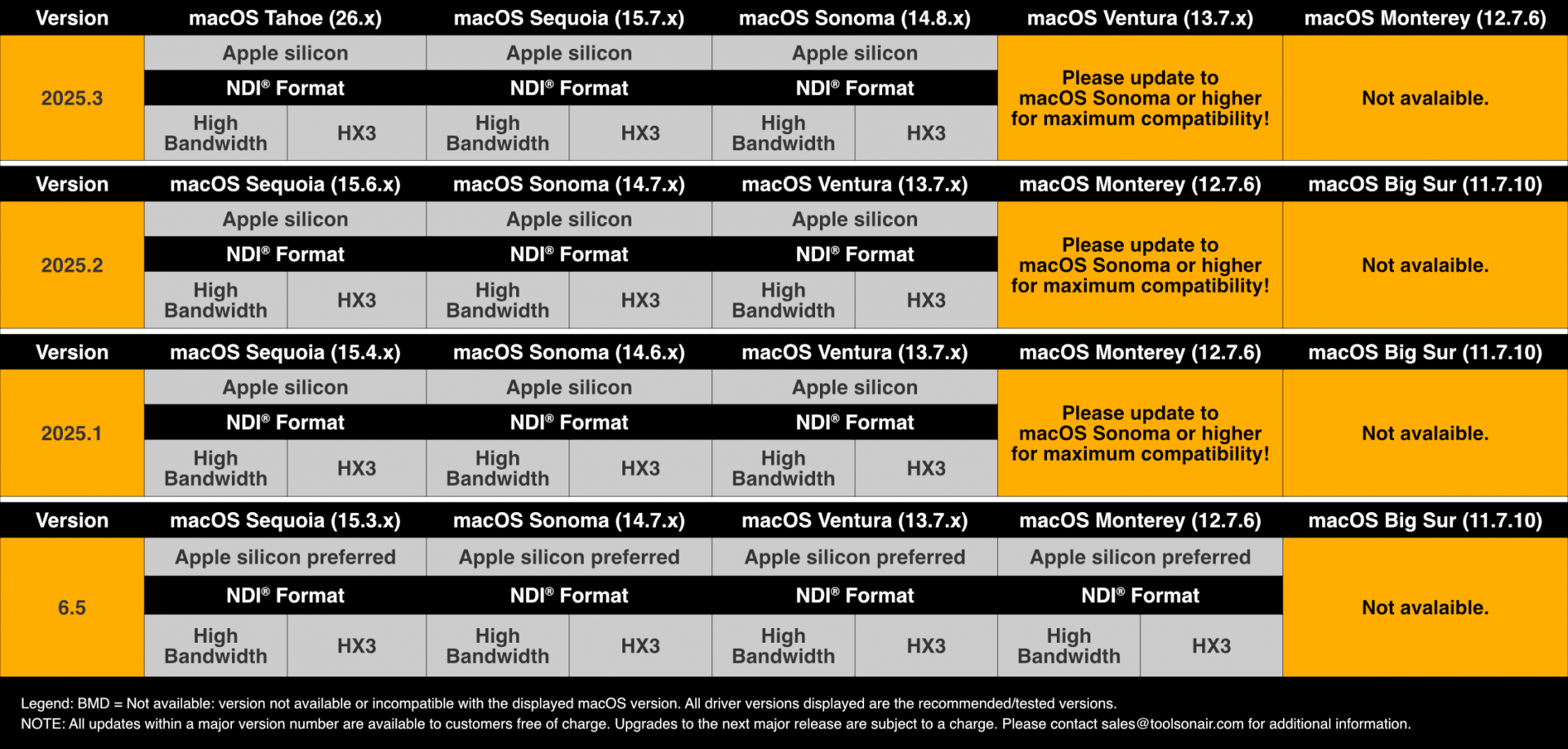 *Legend: 26.x = macOS Tahoe, 15.7.x = macOS Sequoia. macOS Sequoia is the recommended OS version for daily operations!