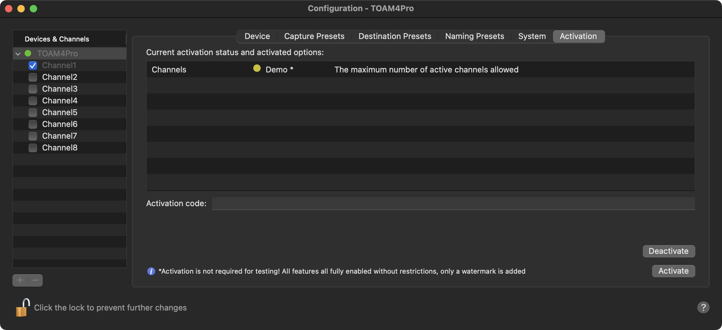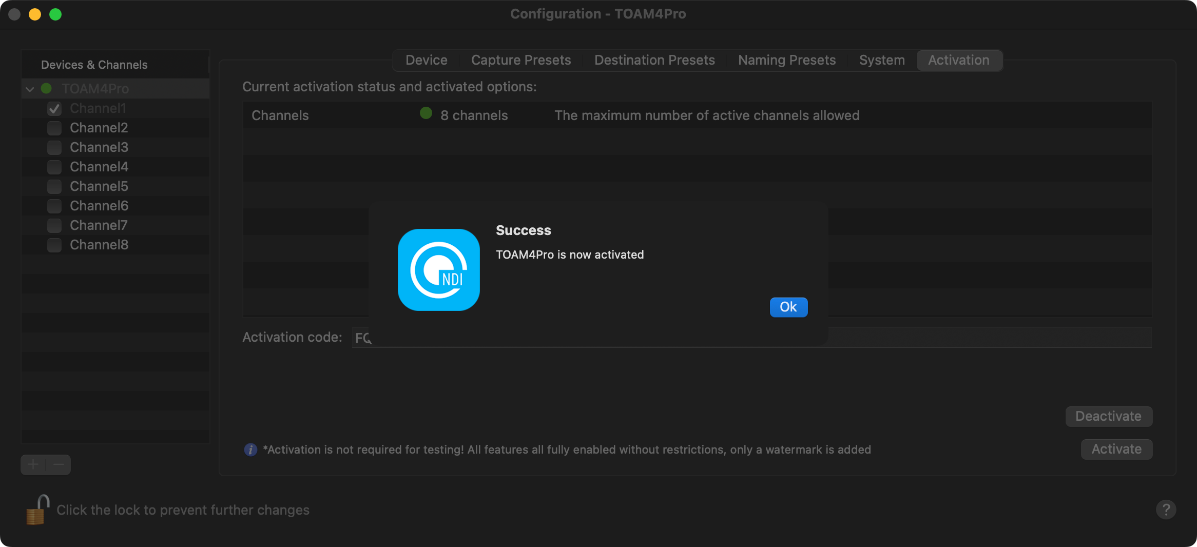 The Just In Mac Lite NDI application comes fully featured in Demo Mode but does not activate automatically, resulting in a ToolsOnAir watermark to be applied on all recordings. Upon purchasing a license, you will receive an activation code to remove the watermark.