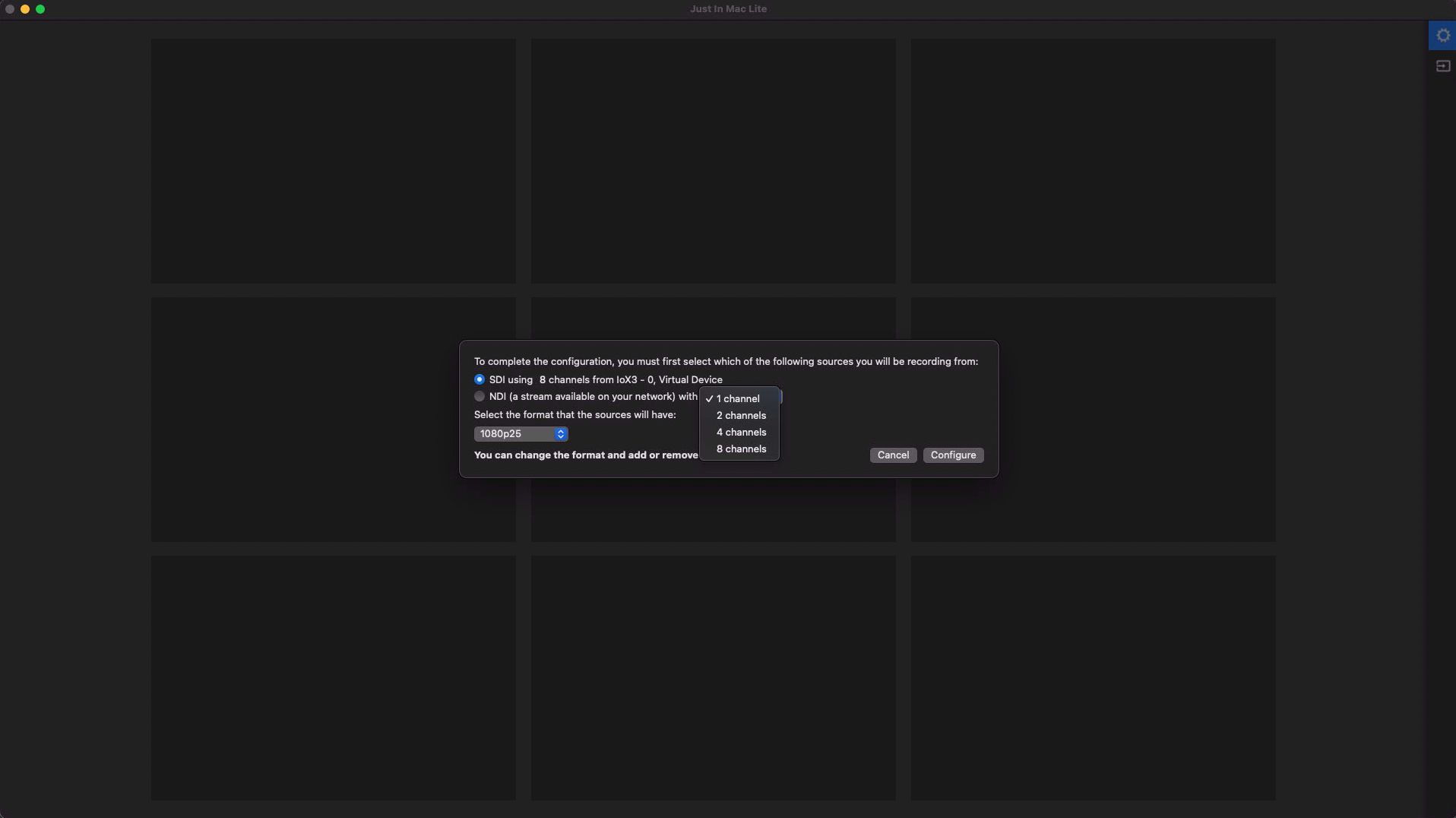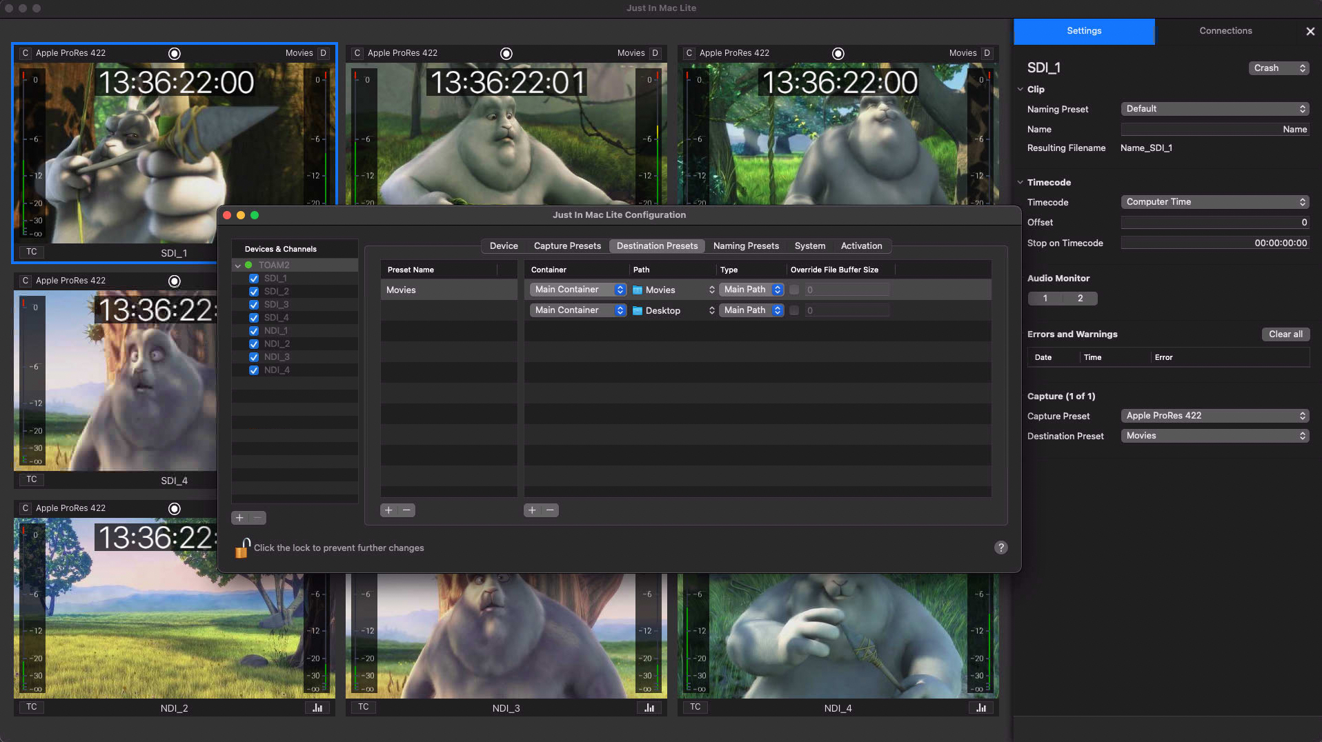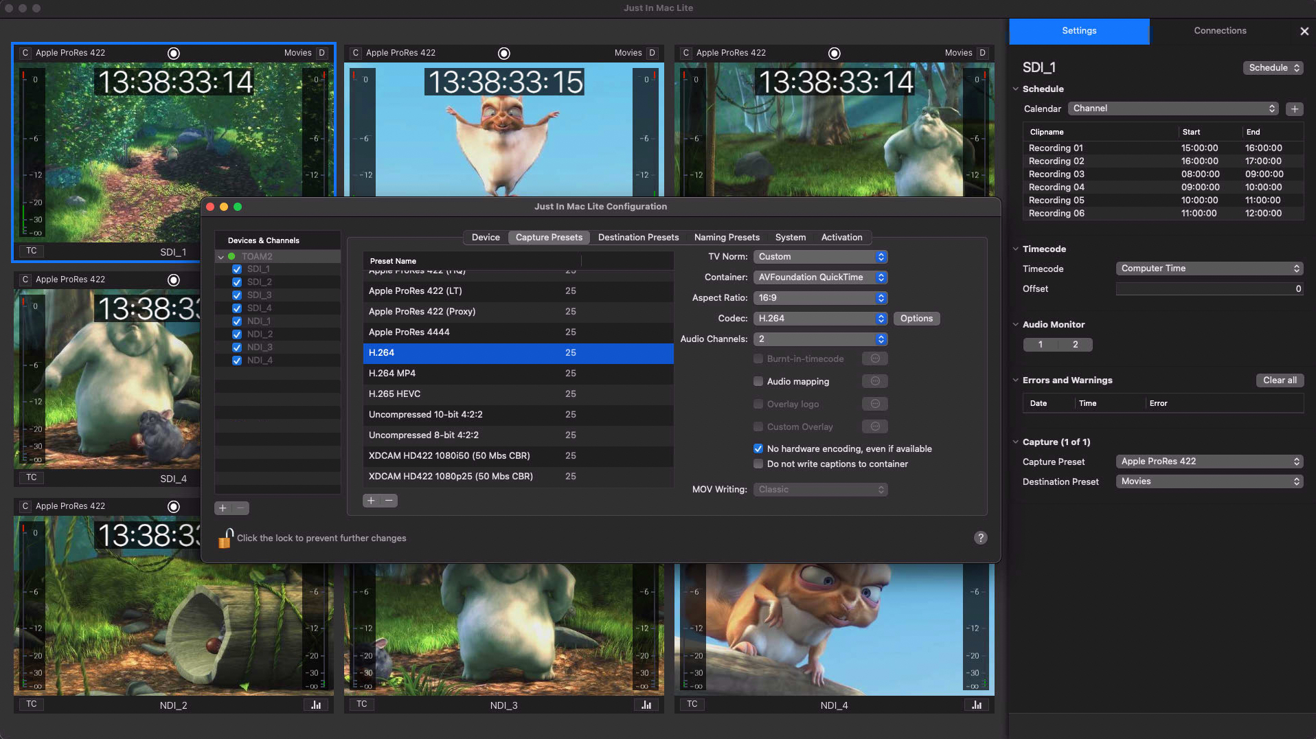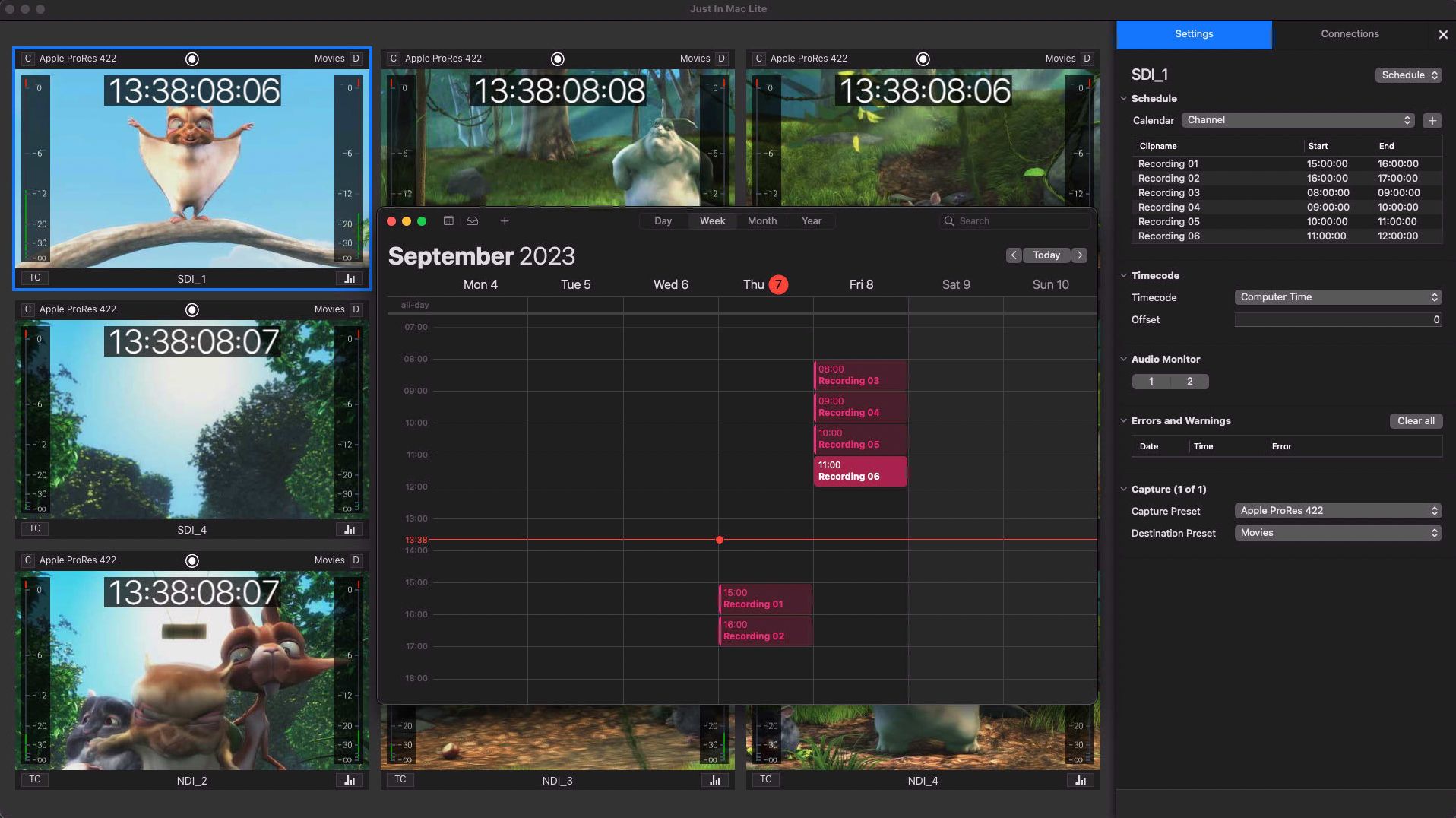 With Just In Mac Lite 2025, you can capture up to 8 channels of SDI, HDMI, and/or NDI® High Bandwidth/HX3 sources in SD, HD, or UHD on a single Mac. Recording is supported in both Crash (Gang and Split) and Schedule modes, depending on the Apple silicon Mac model and the available storage capacity.
