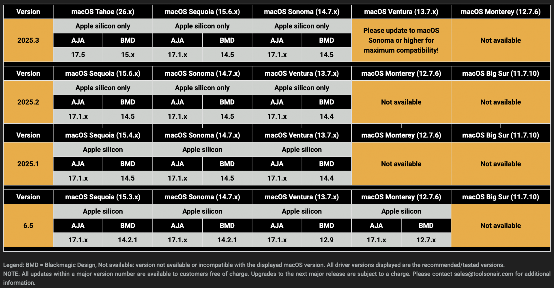 *Legend: 26.x = macOS Tahoe, 15.6.x = macOS Sequoia, 14.7.x = macOS Sonoma. macOS Sonoma and macOS Sequoia are the recommended OS versions for daily operations!