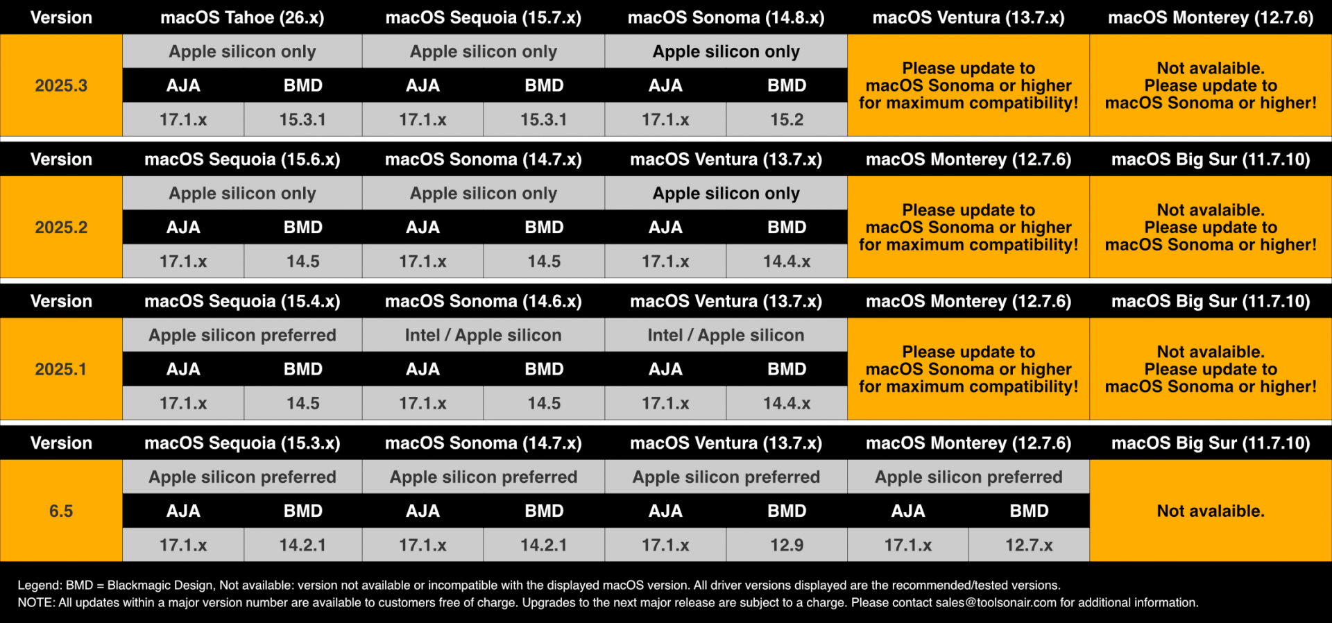 *Legend: 26.x = macOS Tahoe, 15.7.x = macOS Sequoia. macOS Sequoia is the recommended OS version for daily operations!