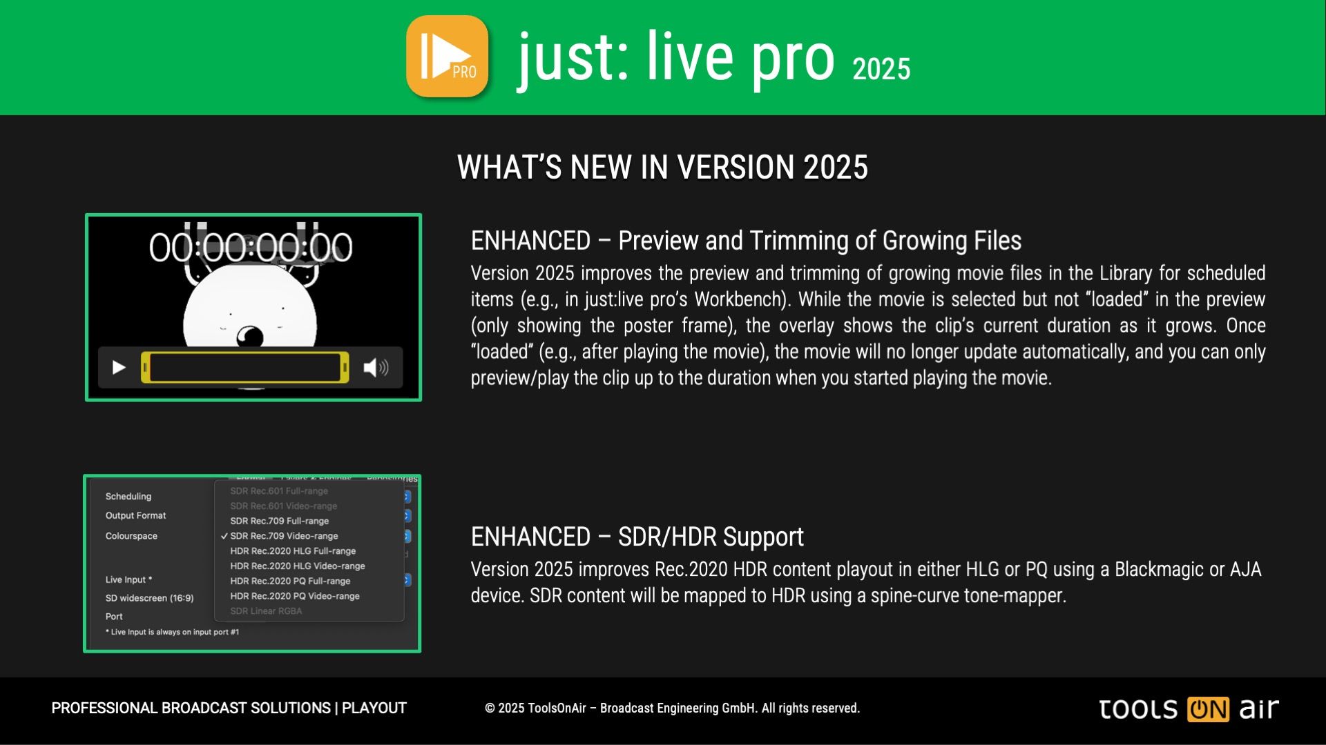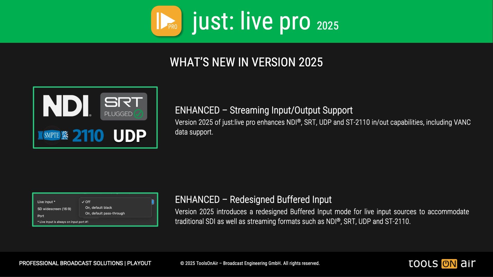 Version 2025 supports NDI®,SRT, UDP and ST-2110 based Playout including the ability to switch to a live source.