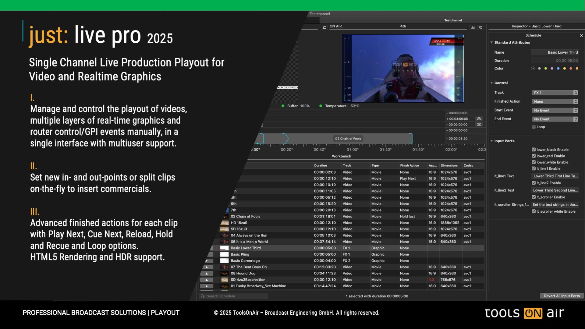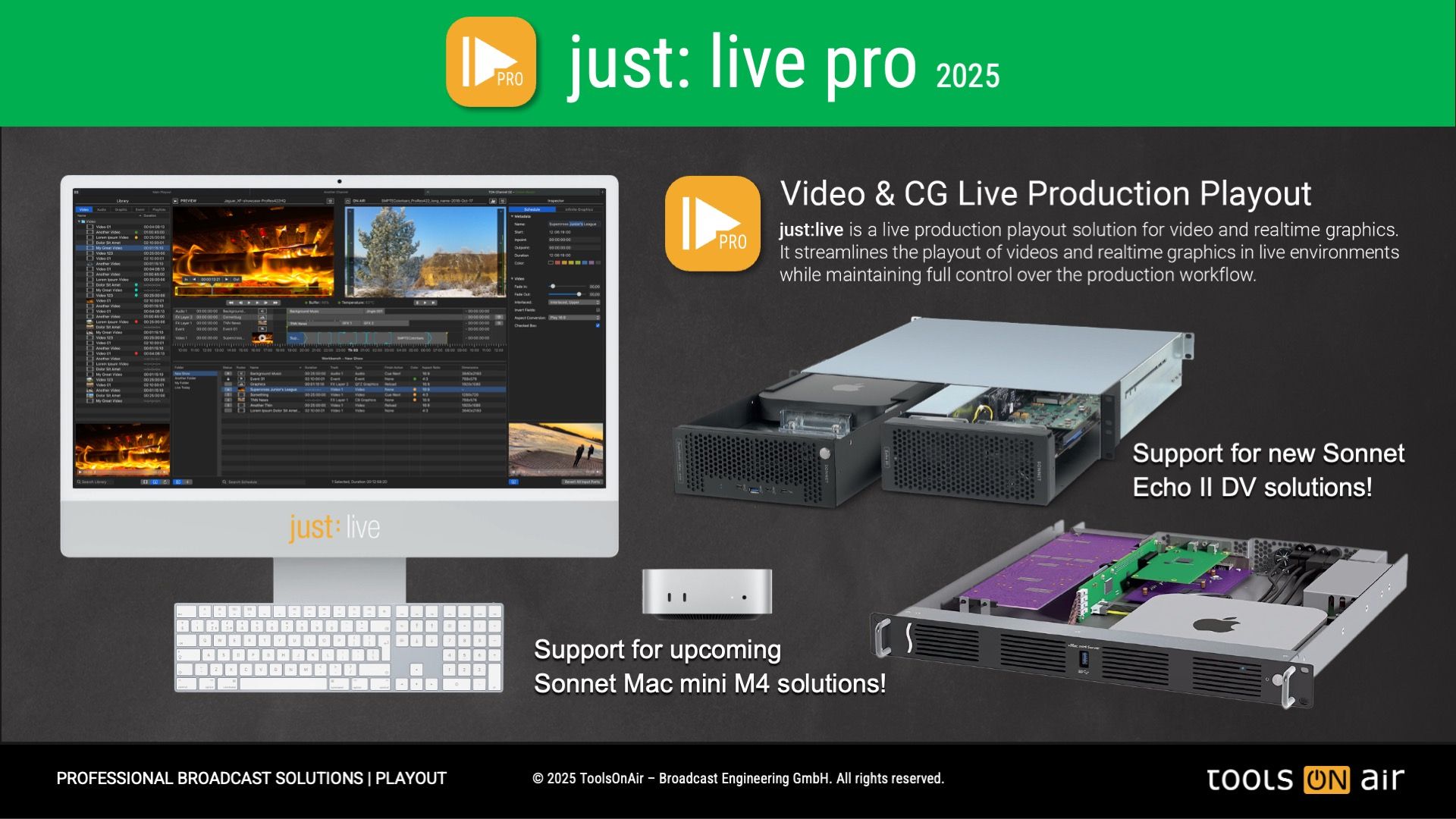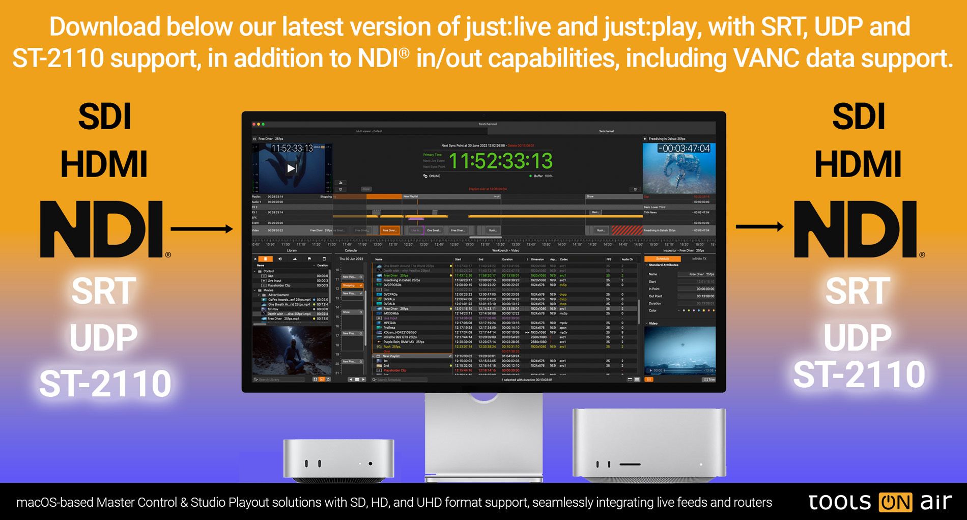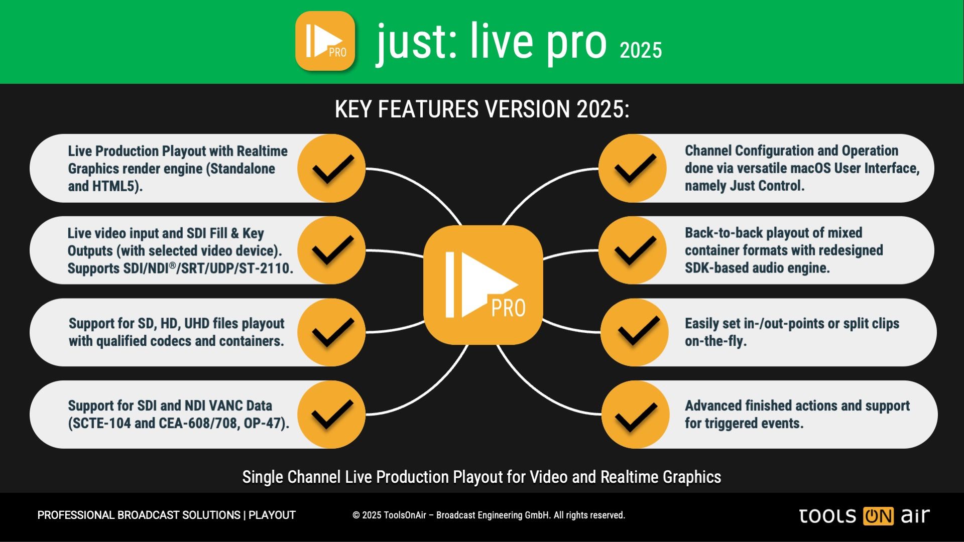 just:live pro 2025 is a macOS-based client-server live production playout solution for video and real-time graphics. It streamlines the playout of videos and graphics in any live environment, supporting SD, HD, and UHD formats as well as SDI, NDI®, SRT, UDP, and ST-2110 live input/output. With full control over the live production workflow and multi-control functionality, it is the ideal solution for professional studio operations.