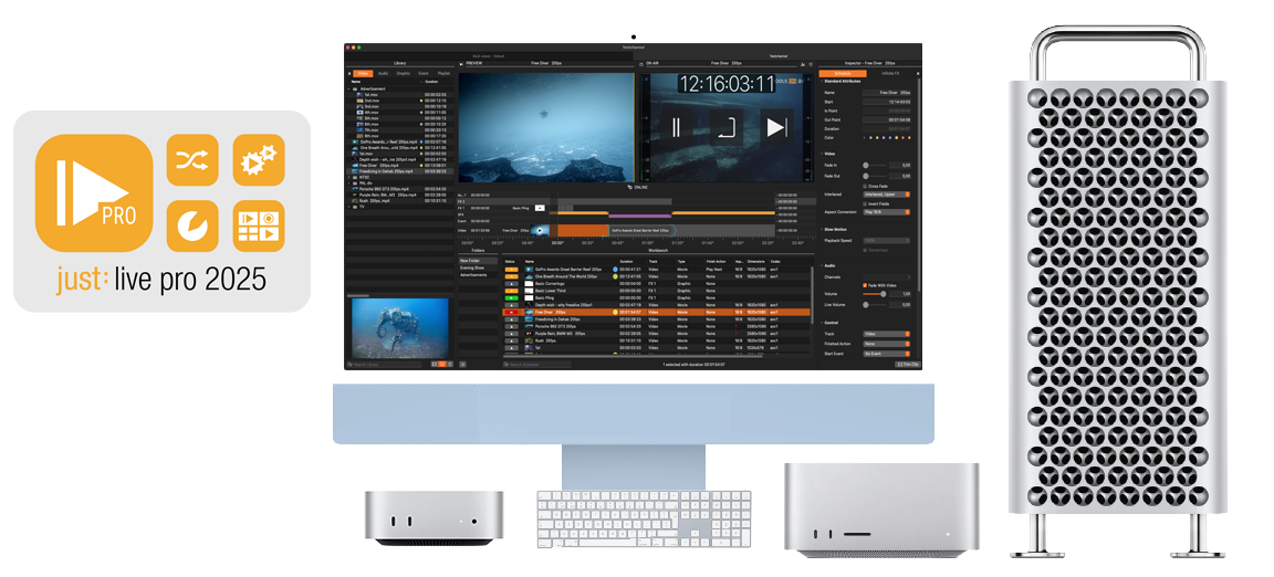 With just:live pro 2025, you decide how your playout environment should look. Thanks to our flexible licensing, the software can run as a compact single-Mac setup or as a scalable server-client architecture for the highest professional standards.