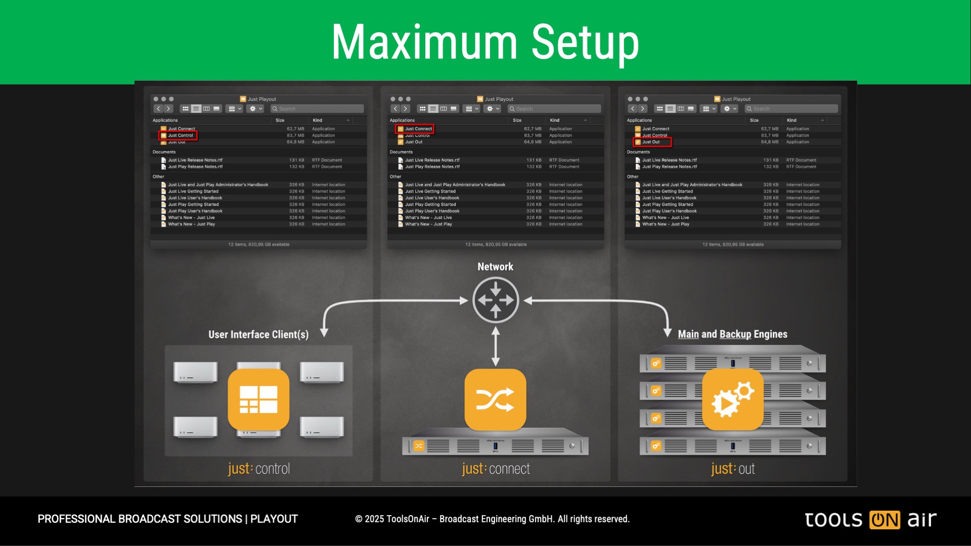 While it is possible to install Just Out, Just Connect and Just Control on a single machine, there's also the possibility to distribute the playout components to multiple machines. This chapter covers different setup variants.