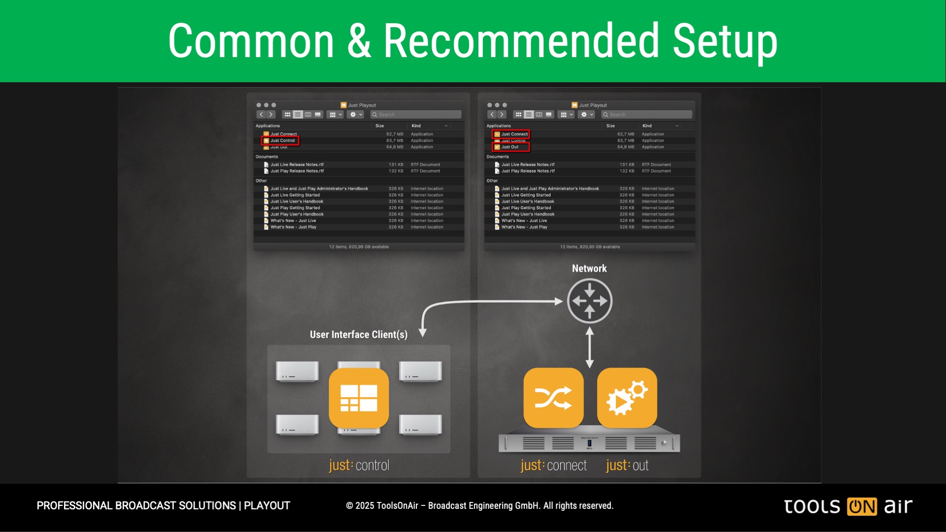 just:live pro 2025 can be configured as a standalone installation on a single Mac, or deployed in a distributed client-server architecture. The client-server mode enables centralized control, multi-user access, and enterprise-grade stability to meet demanding broadcast requirements.
