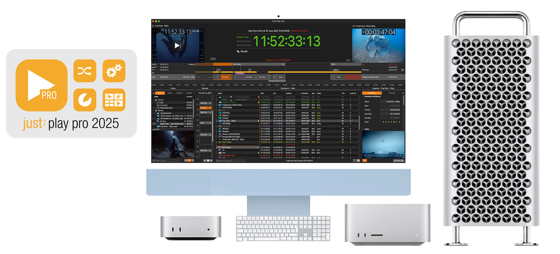 With just:play pro 2025, you decide how your playout environment should look. Thanks to our flexible licensing, the software can run as a compact single-Mac setup or as a scalable server-client architecture for the highest professional standards.