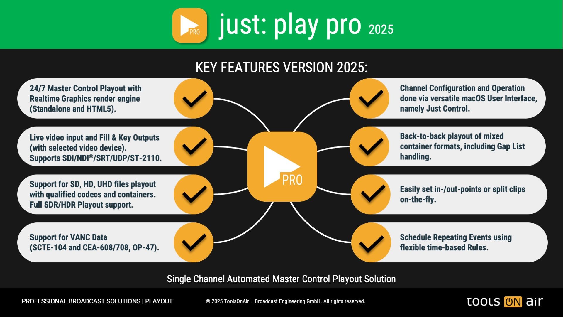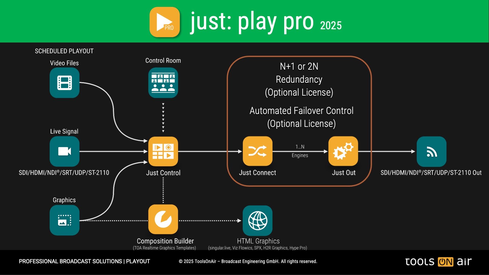 just:play pro 2025 is a single channel Client-Server based Master Control Playout solution with SD, HD, UHD format and SDI, NDI®, SRT, UDP, ST-2110 Live Input/Output support, seamlessly integrating live feeds and routers as well as all kinds of events and static/animated realtime graphics.