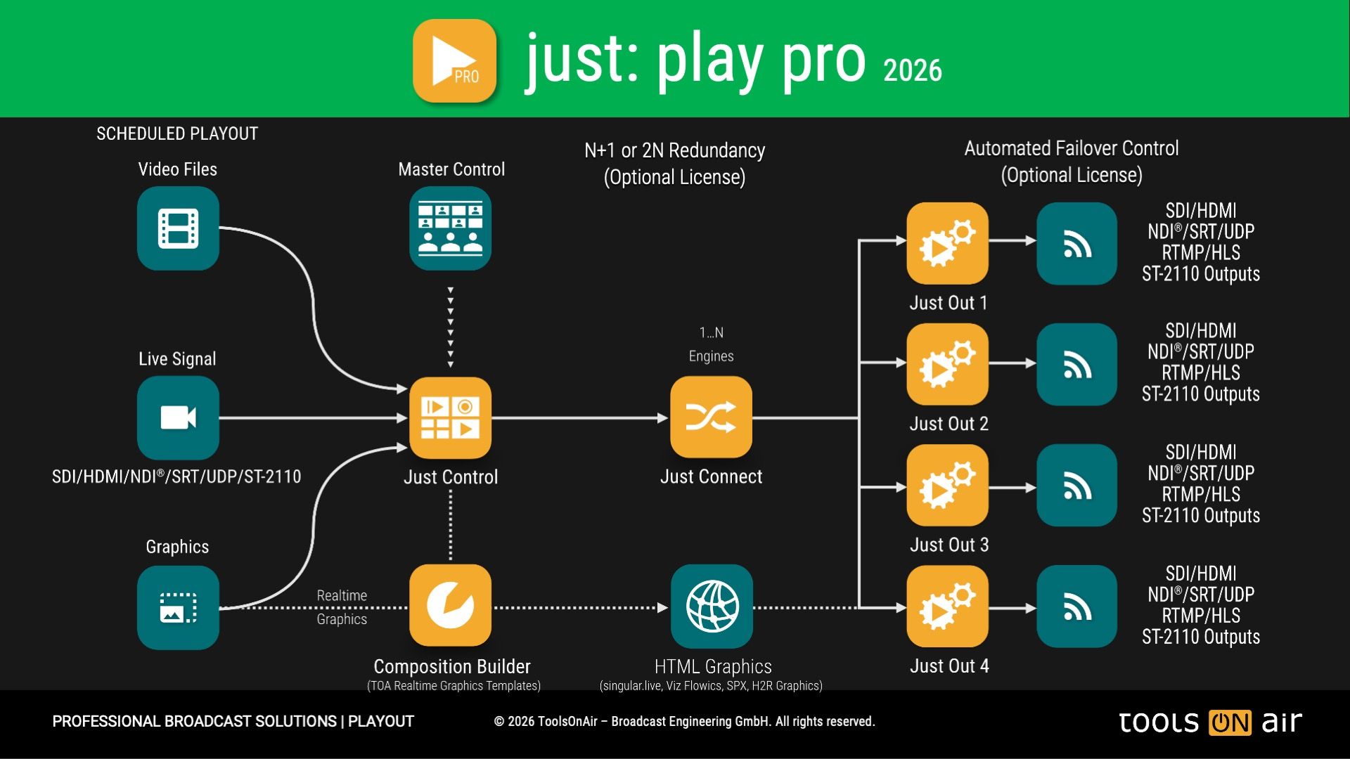just:play pro 2025 is a multi-channel Client-Server based Master Control Playout solution with SD, HD, UHD format and SDI, NDI® High Bandwidth, SRT, UDP, ST-2110 Live Input/Output support, seamlessly integrating live feeds and routers as well as all kinds of events and static/animated realtime graphics.