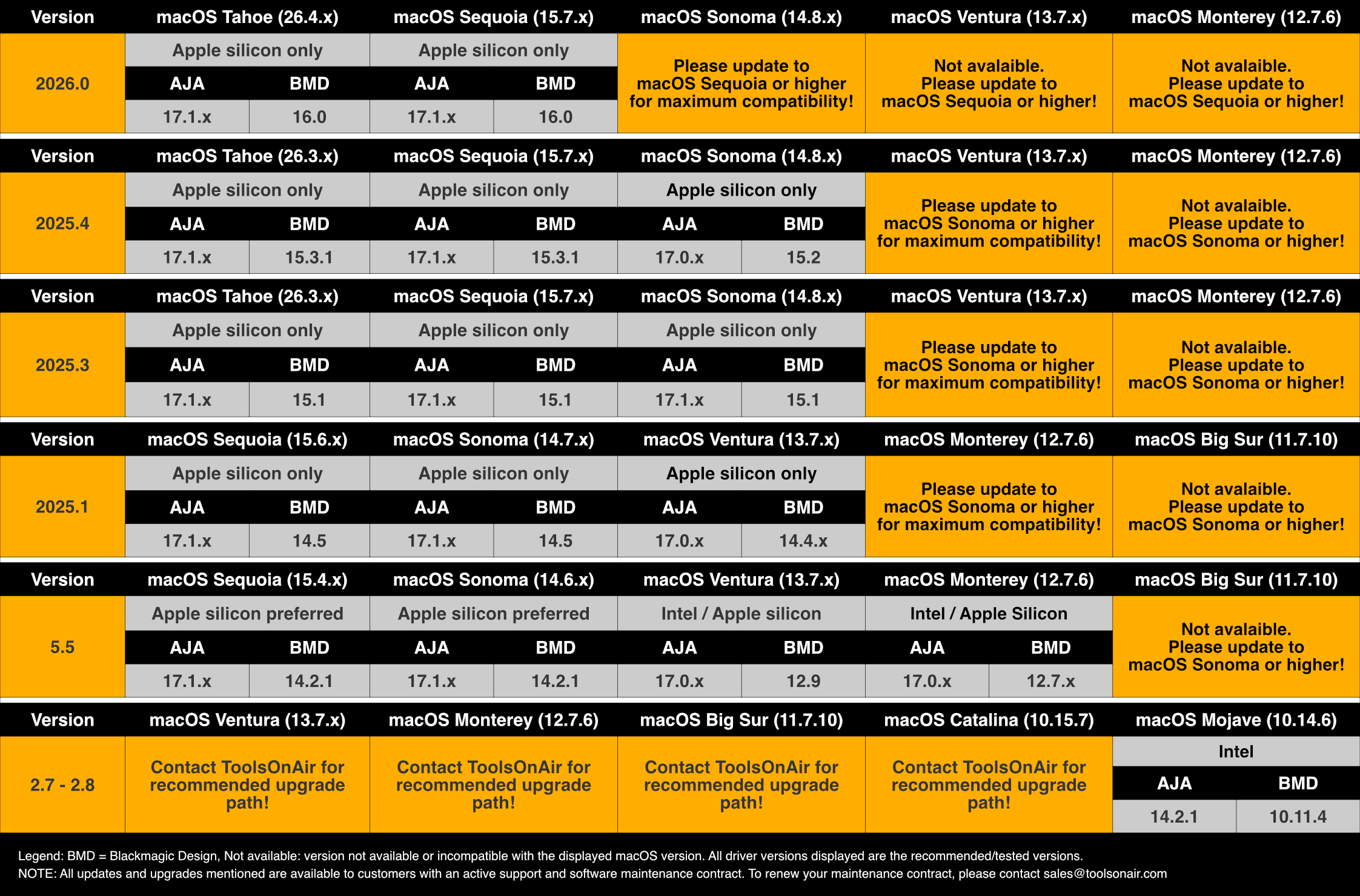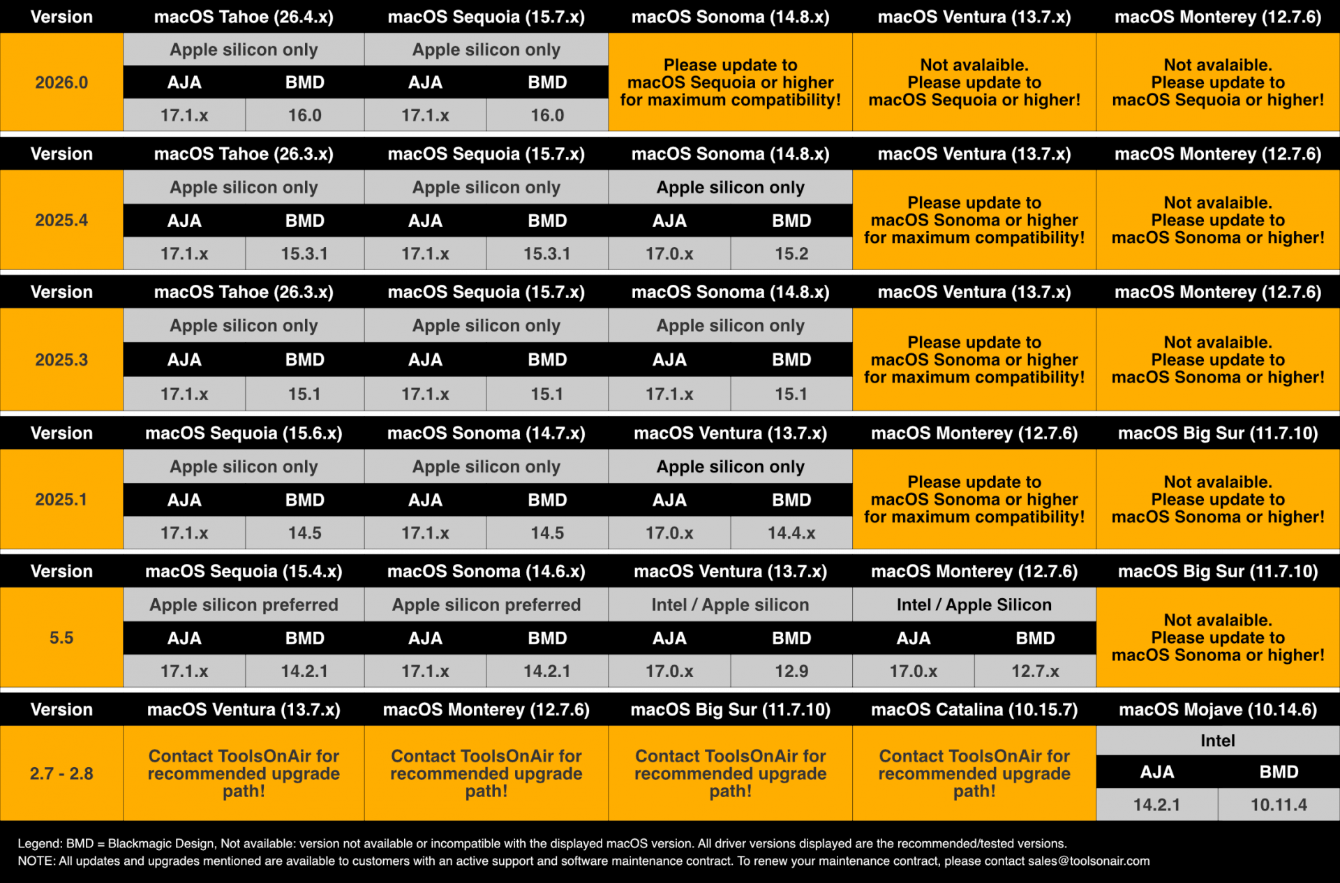 *Legend: 26.4.x = macOS Tahoe. macOS Tahoe is the recommended OS version for daily operations!