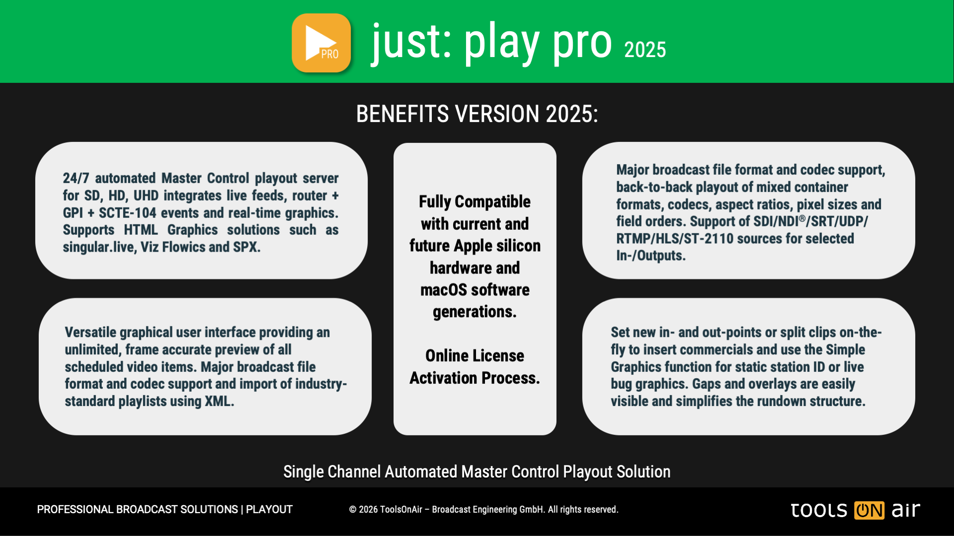 **Please verify that the available Media Engines in all Apple silicon based models meet your recording requirements, before buying a just:play pro 2025 license. You can test the full feature enabled just:play pro 2025 application for free by downloading the trial version from the related solution page. The trial version will add a ToolsOnAir watermark to the recordings. By licensing just:play pro 2025 the watermark will automatically be removed. All supported Mac models: min. of 16 GB of RAM highly recommended!