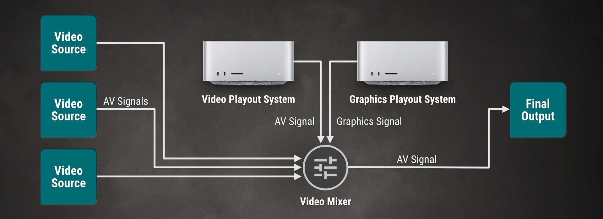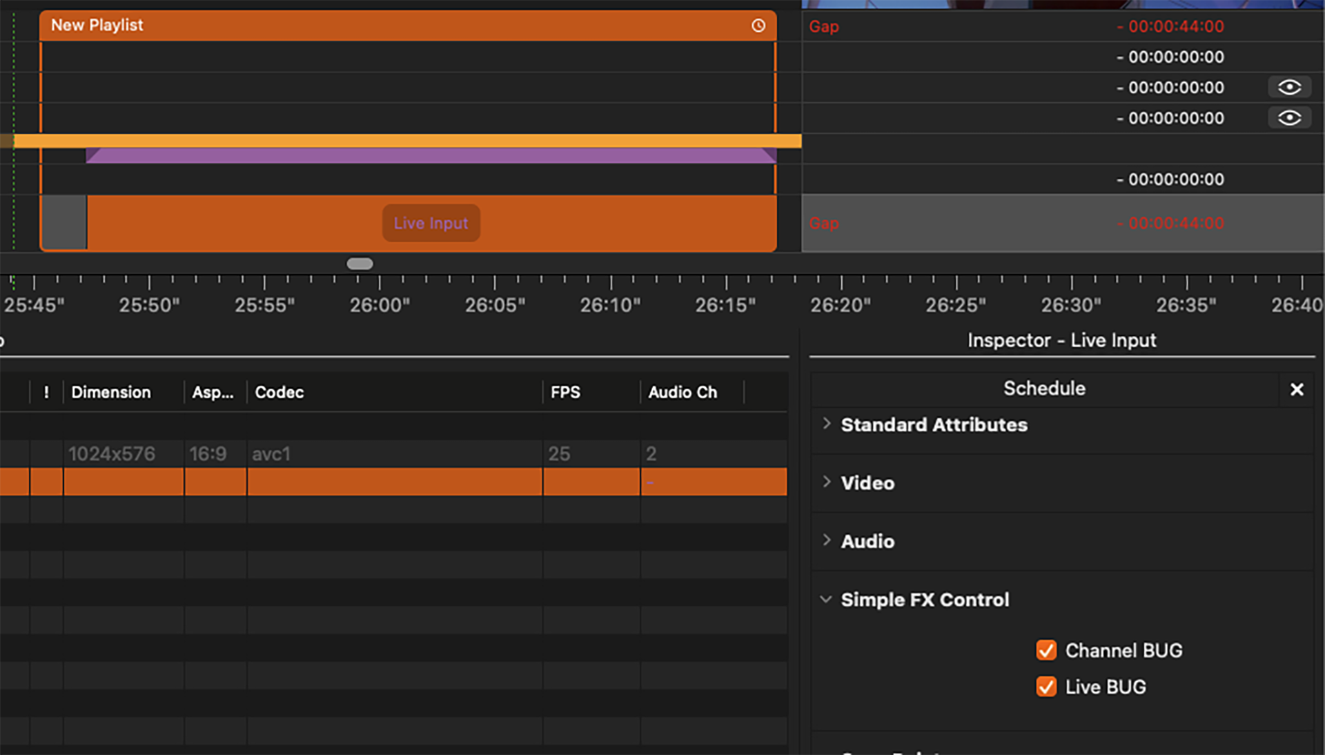 Besides playing Videos and Graphics, our playout solutions also allow you to manage live input signals such as live studio signals or satellite feeds, and send them to the SDI (or any supported streaming) output.