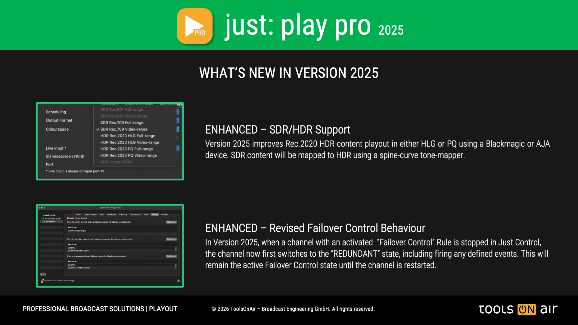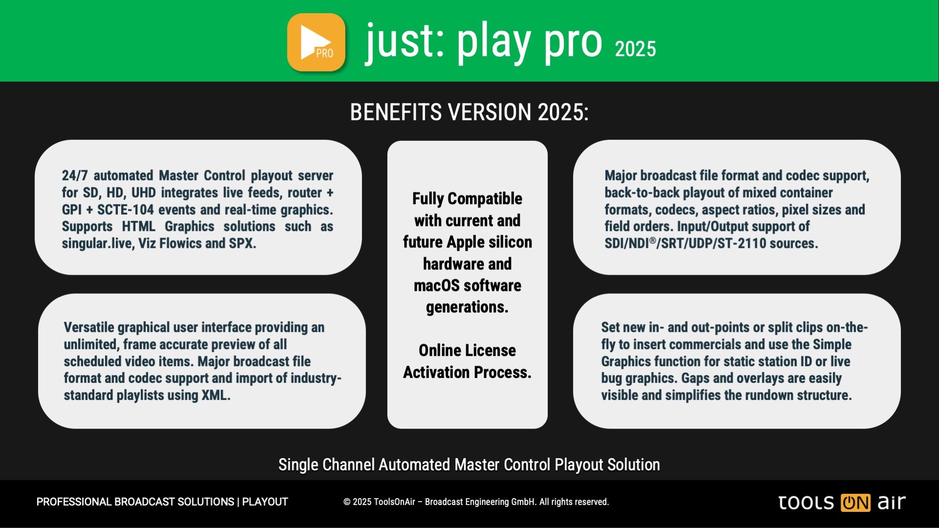 With this addition, just:play pro 2025 empowers broadcast production professionals with a modern, hassle-free licensing solution that keeps operations agile, secure, and always ready for the next challenge. The process is straightforward, requiring just an internet connection and a valid license key upon the first activation.