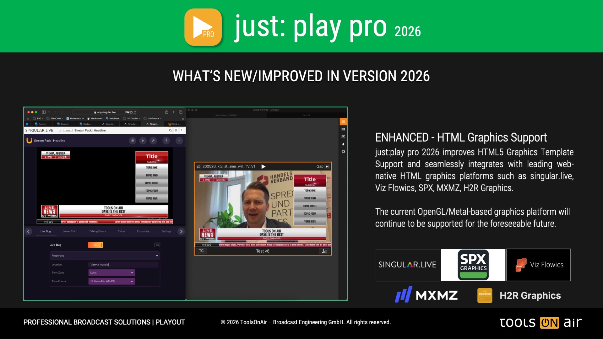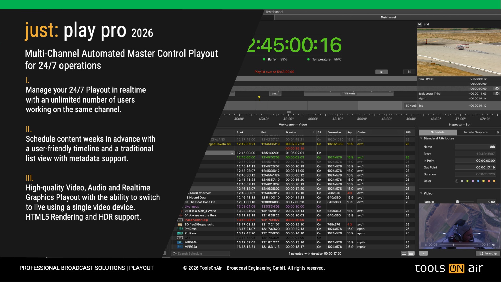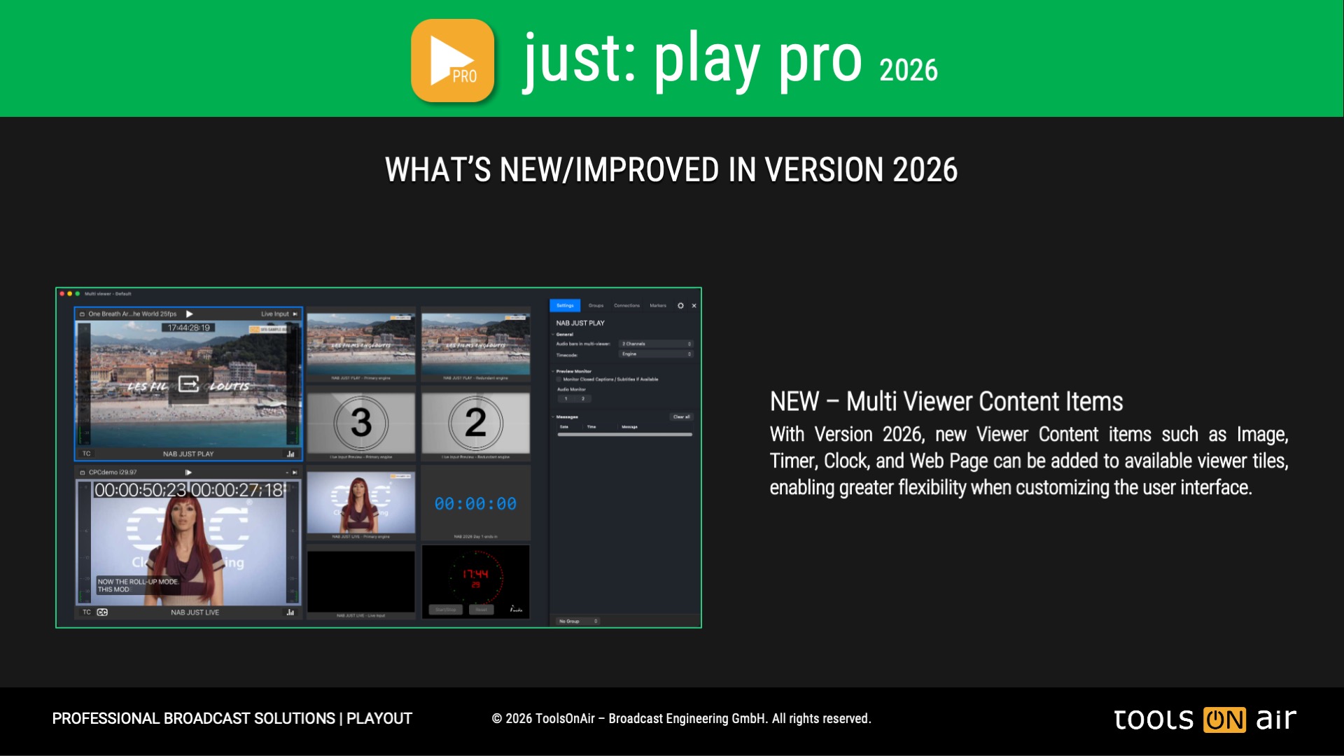 ToolsOnAir has released version 2026.0 of the Pro Playout edition. Please click on the image to view more detailed information about the new features in this latest release.