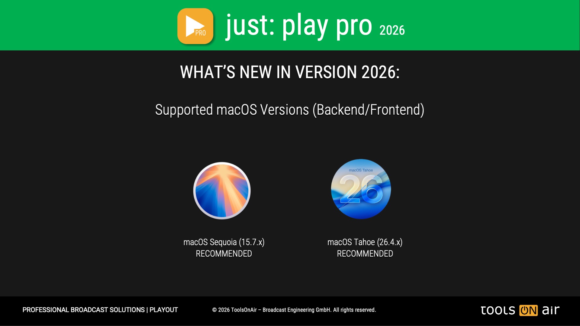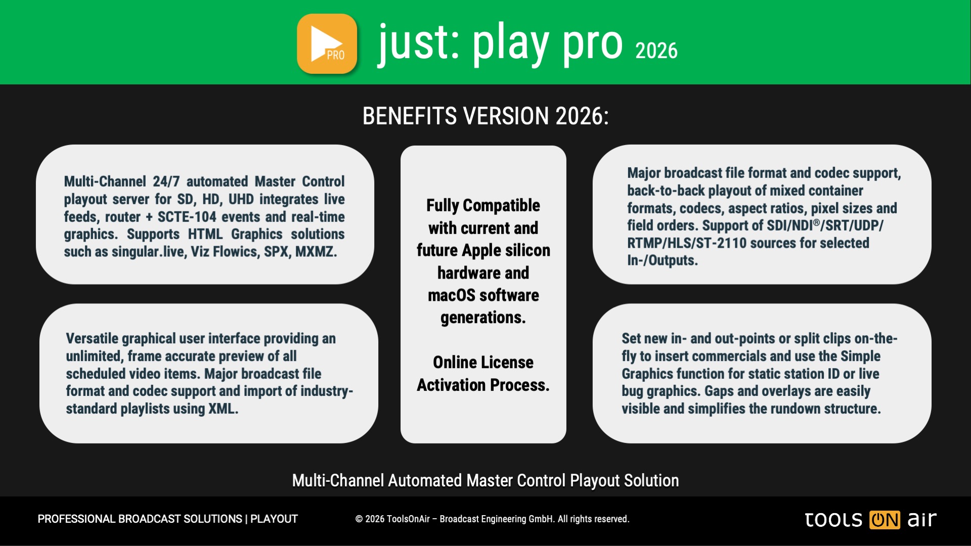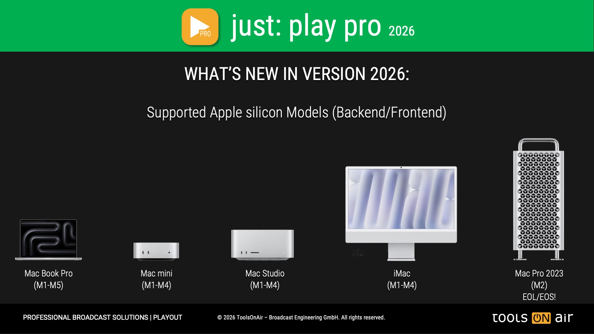 **Please verify that the available Media Engines in all Apple silicon based models meet your recording requirements, before buying a just:play pro 2025 license. You can test the full feature enabled just:play pro 2025 application for free by downloading the trial version from the related solution page. The trial version will add a ToolsOnAir watermark to the playout output. By licensing just:play pro 2025 the watermark will automatically be removed. All supported Mac models: min. of 16 GB of RAM highly recommended!