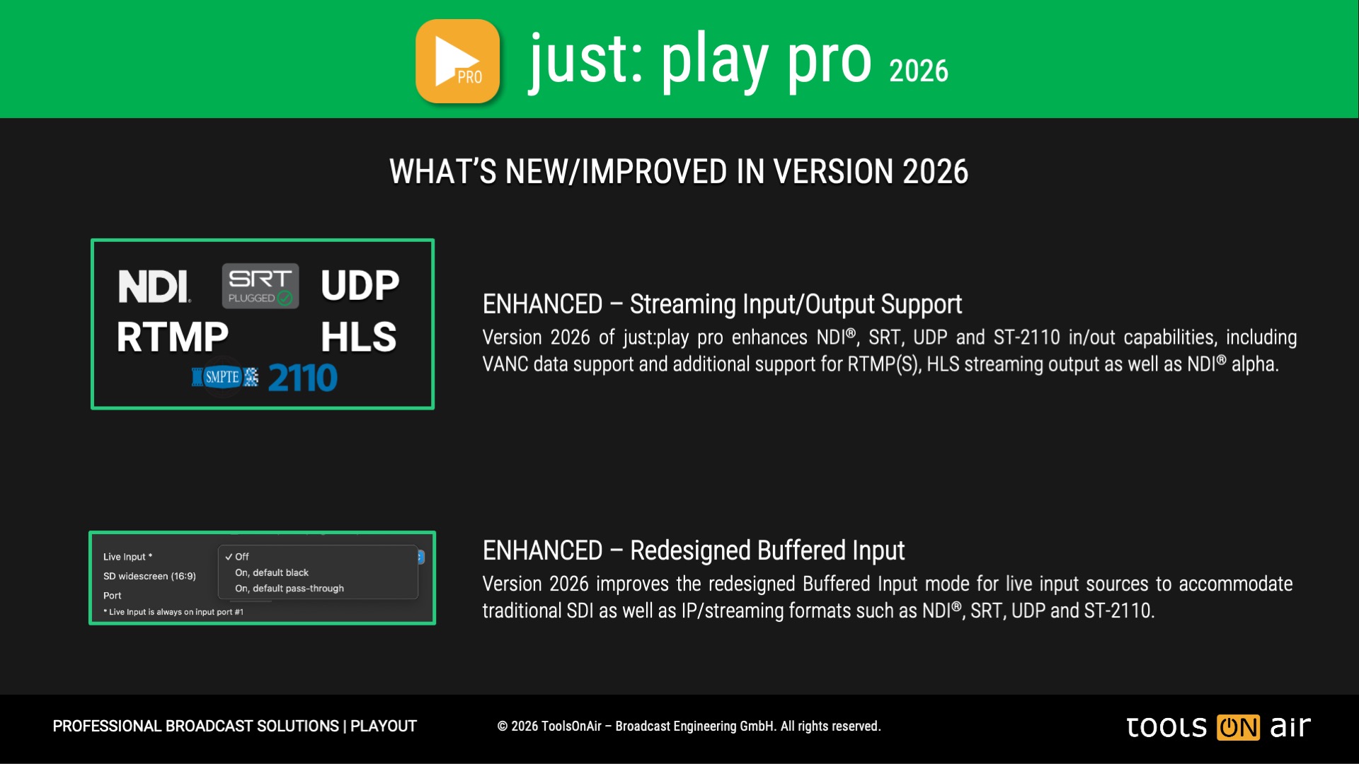 Version 2026.0 supports NDI®,SRT, UDP, RTMP, HLS and ST-2110 based Playout including the ability to switch to a live source.