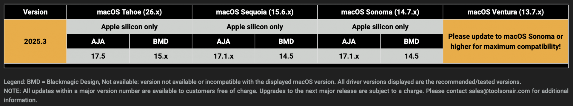 *Legend: 26.x = macOS Tahoe, 15.6.x = macOS Sequoia, 14.7.x = macOS Sonoma. macOS Sonoma and macOS Sequoia are the recommended OS versions for daily operations!