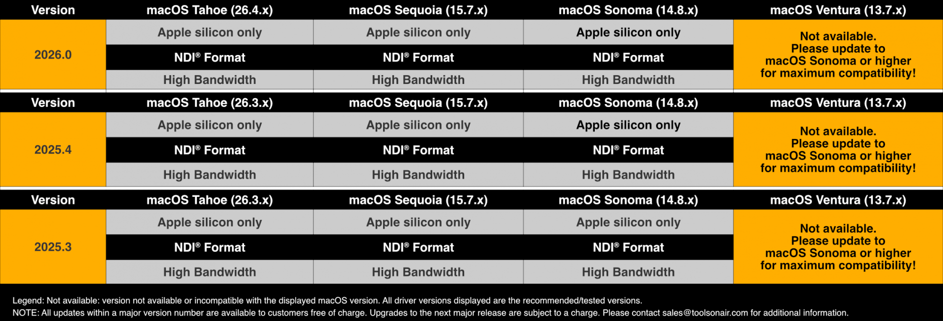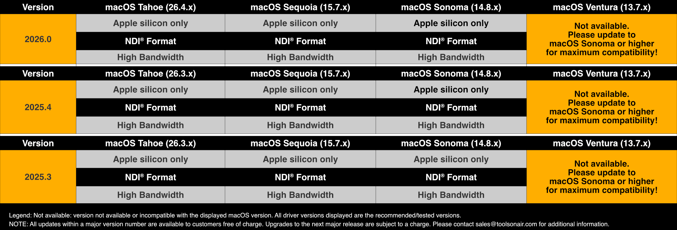 *Legend: 26.4.x = macOS Tahoe, 15.7.x = macOS Sequoia, 14.8.x = macOS Sonoma. macOS Sequoia and macOS Tahoe are the recommended OS versions for daily operations!