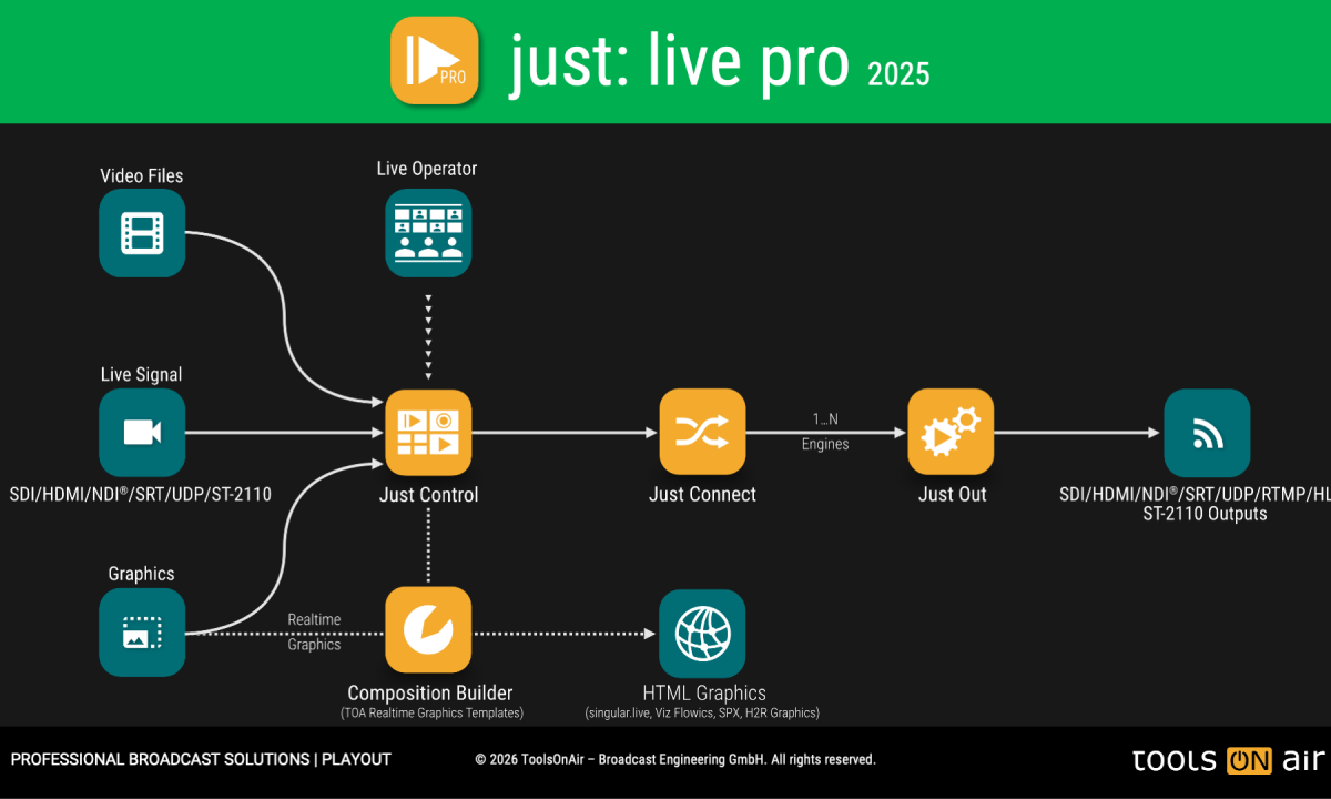 just:live pro 2025 is a Single Channel Live Production Playout solution for video and static or real-time graphics. It is designed to run on macOS and to meet the fast-paced, time-critical...