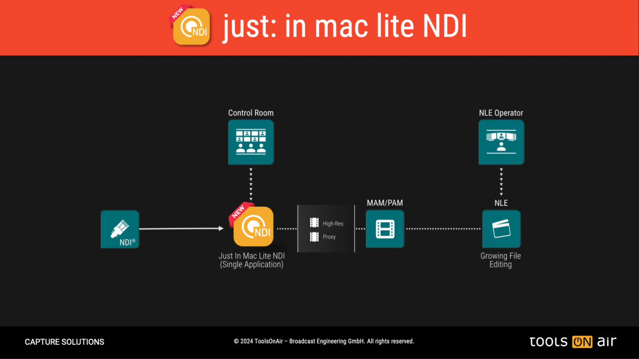 just:in mac lite NDI is a streamlined media capture solution designed specifically for macOS. It lets you record up to 8 channels of HD or UHD video on an Apple silicon Mac, from NDIĀ® High Bandwidth/HX3 format sources, including growing file support and using either Crash or Schedule recording modes. For remote operations or third-party automation scenarios, it features a comprehensive and easily accessible REST API.