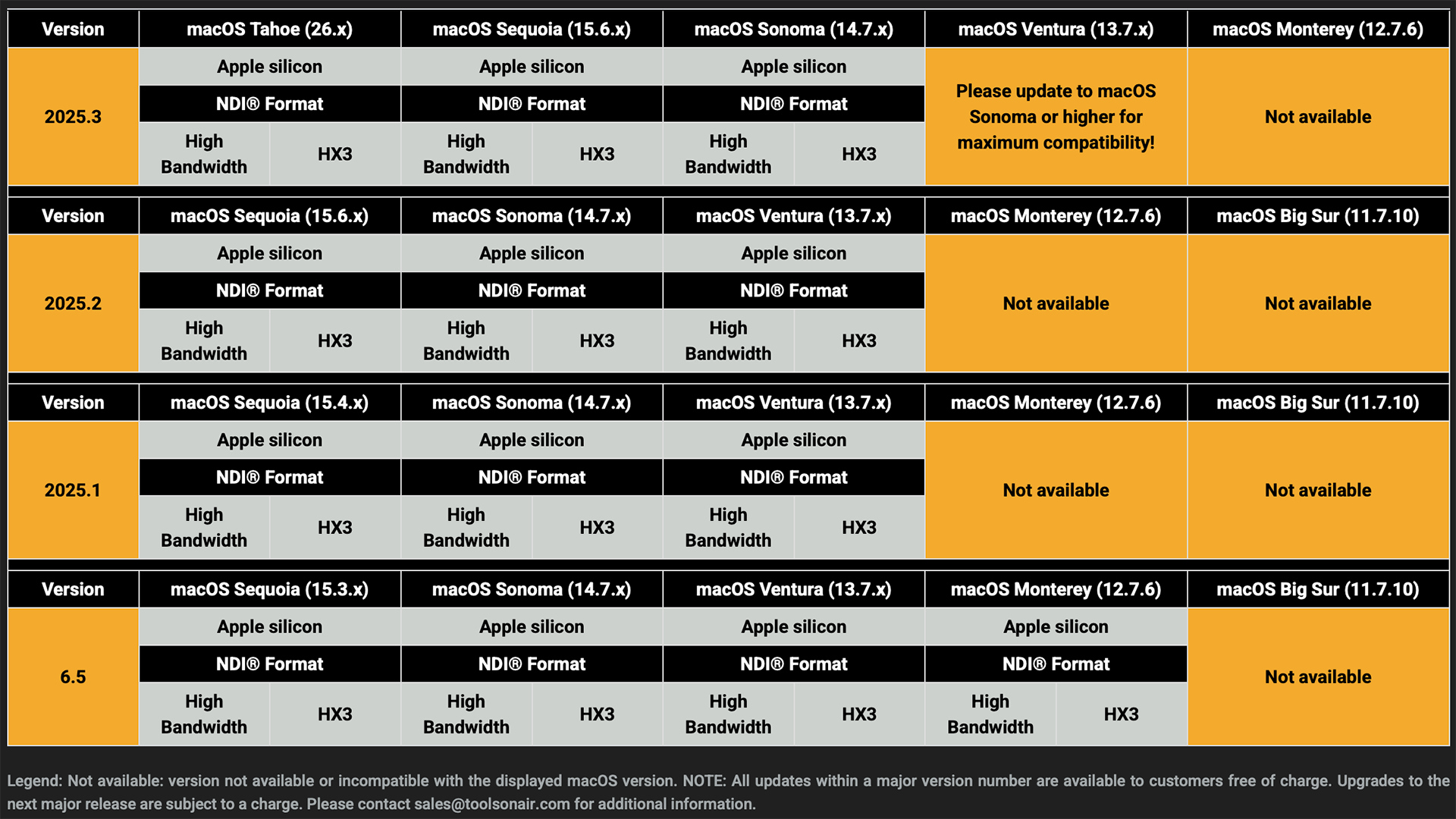 *Legend: 26.x = macOS Tahoe, 15.6.x = macOS Sequoia, 14.7.x = macOS Sonoma. macOS Sonoma and macOS Sequoia are the recommended OS versions for daily operations!