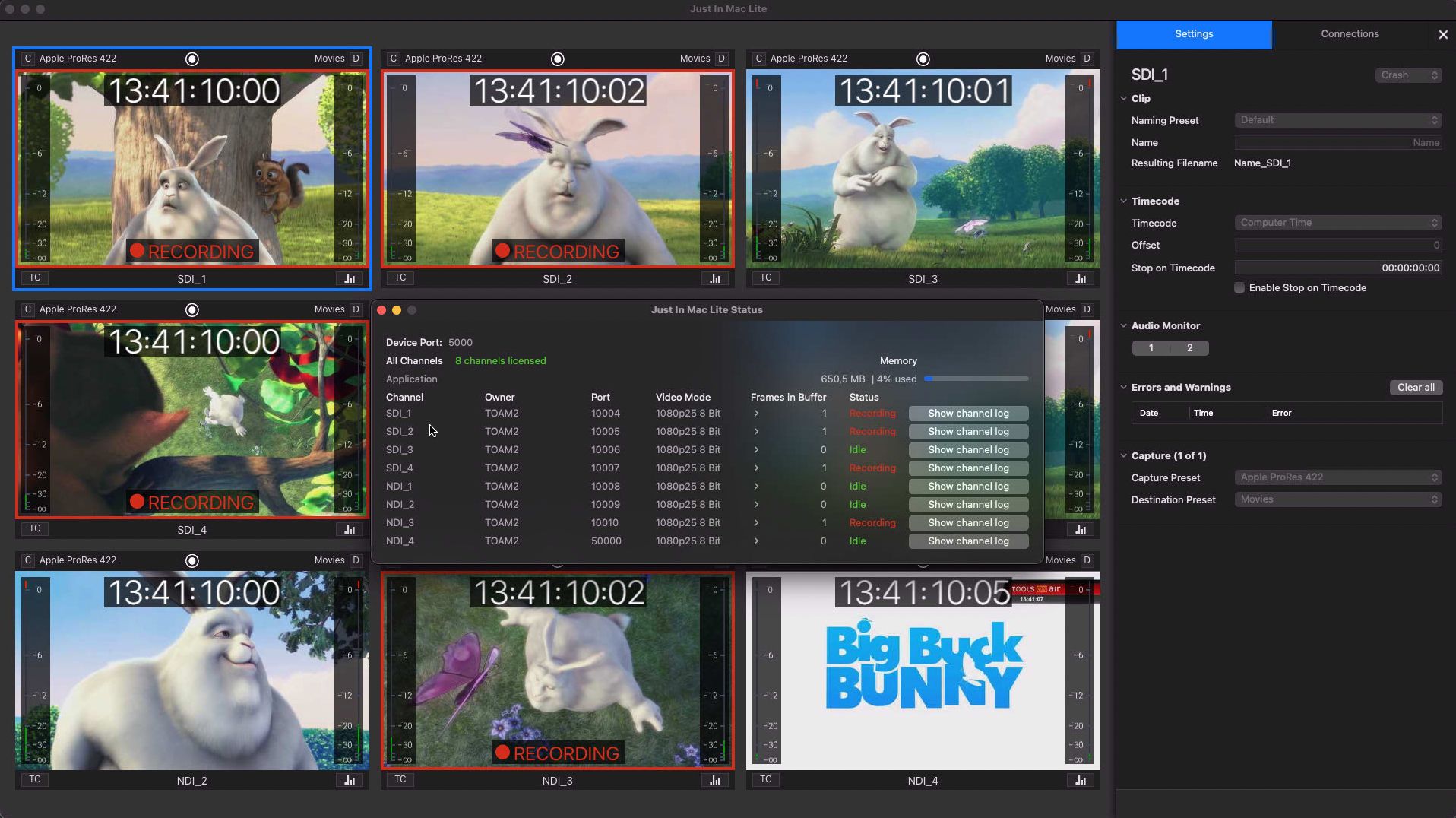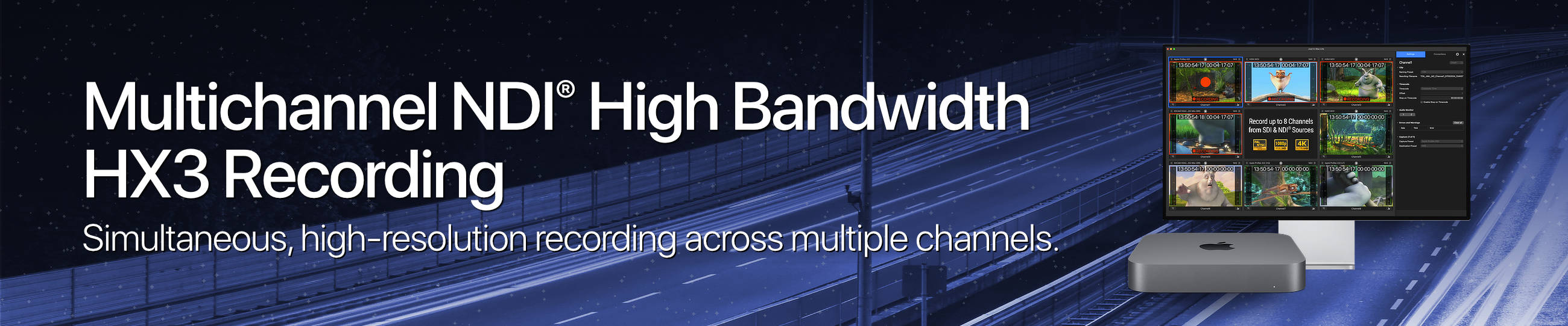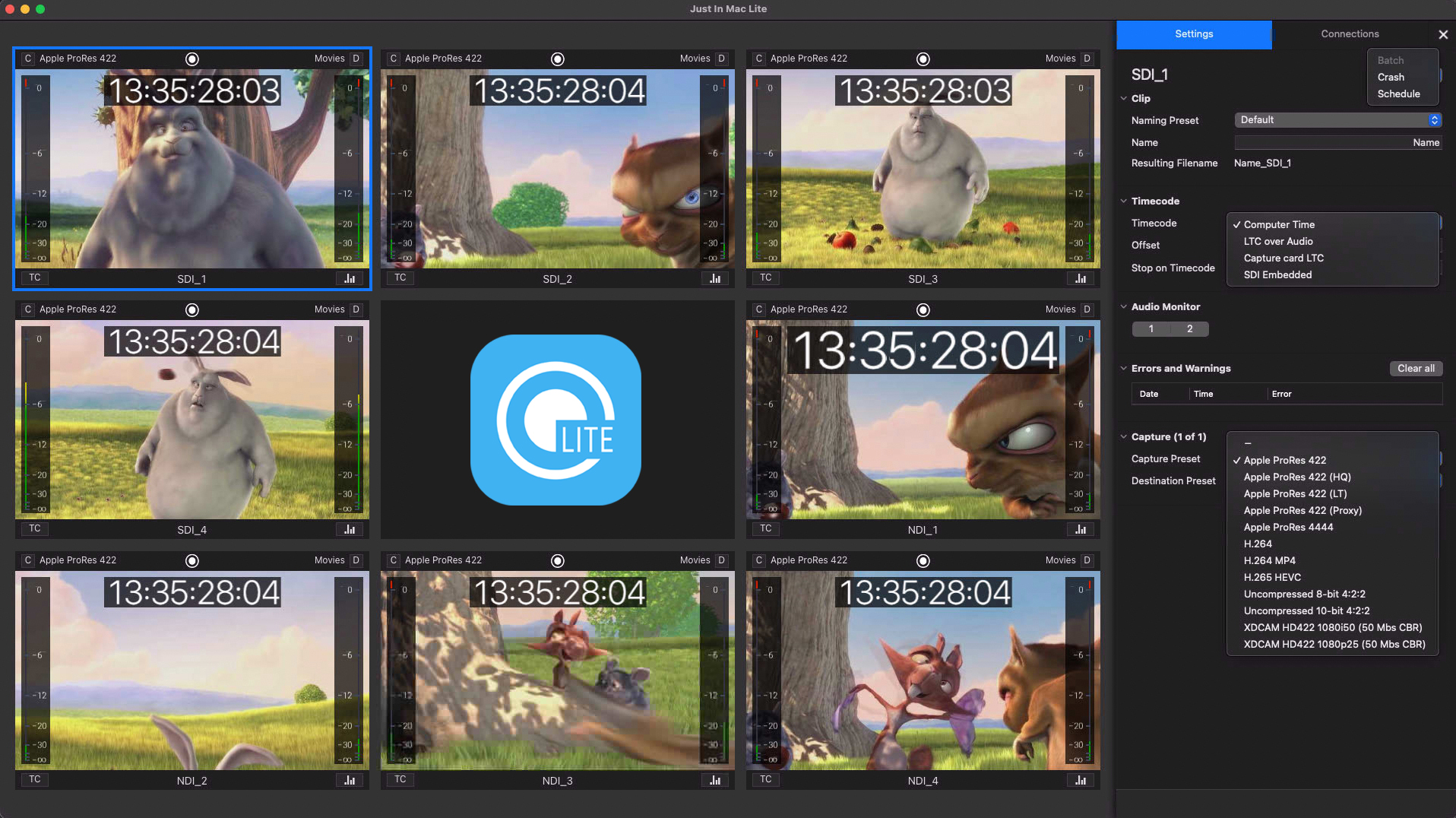 With Just In Mac Lite 2025, you can capture up to 8 channels of SDI, HDMI, and/or NDI® High Bandwidth/HX3 sources in SD, HD, or UHD on a single Mac. Recording is supported in both Crash (Gang and Split) and Schedule modes, depending on the Apple silicon Mac model and the available storage capacity.