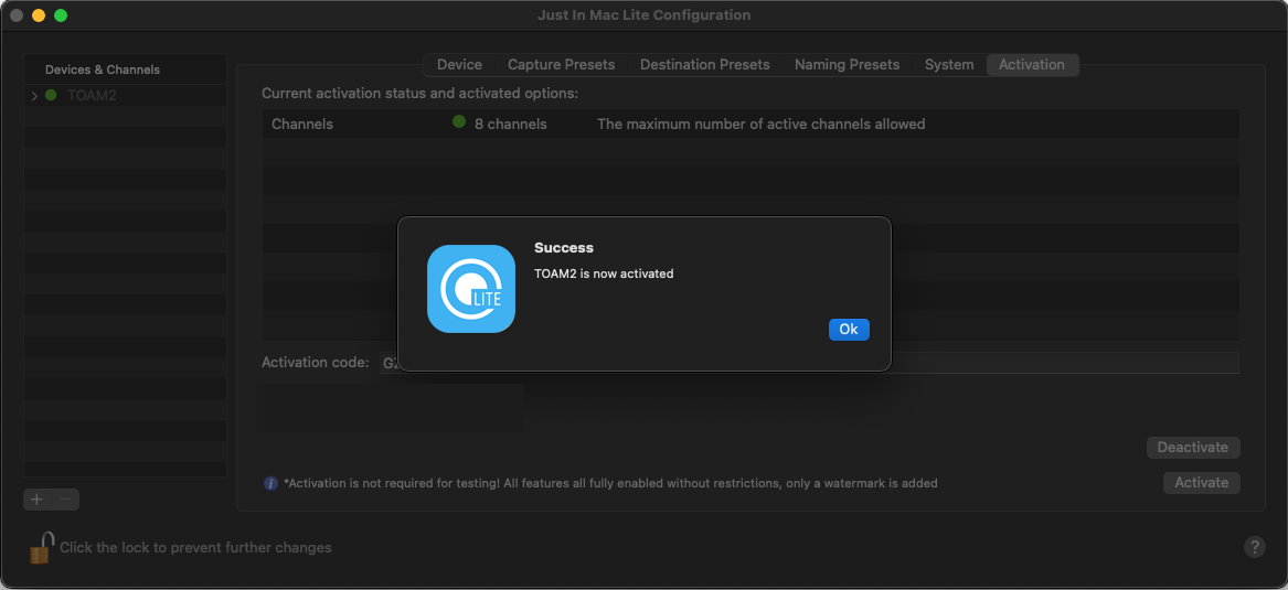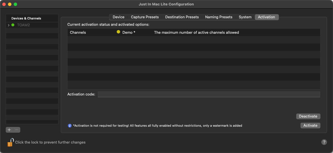 The Just In Mac Lite application comes fully featured in Demo Mode but does not activate automatically, resulting in a ToolsOnAir watermark to be applied on all recordings. Upon purchasing a license, you will receive an activation code to remove the watermark.