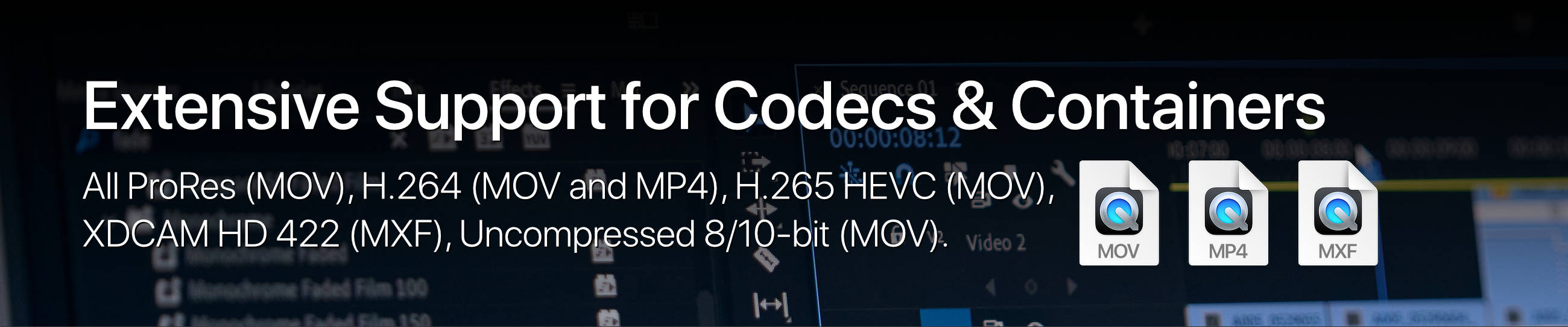- Supported Codecs and Containers: All ProRes (MOV), H.264 (MOV and MP4), H.265 HEVC (MOV), XDCAM HD 422 (MXF), Uncompressed 8/10-bit (MOV)