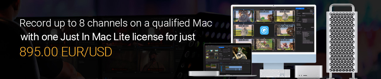 To run a watermark-free version of the Just In Mac Lite application, please click on the “Purchase” button. The Just In Mac Lite application sells for 890 EUR/USD and includes an 8-channel recording license. This is a Software license only and does not include any Mac or video device hardware (to be purchased separately).