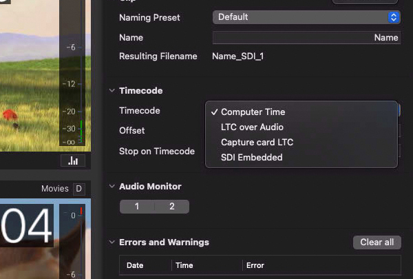 - Supported Time Code Sources: Computer Time, LTC over Audio, Capture Card LTC, SDI Embedded.