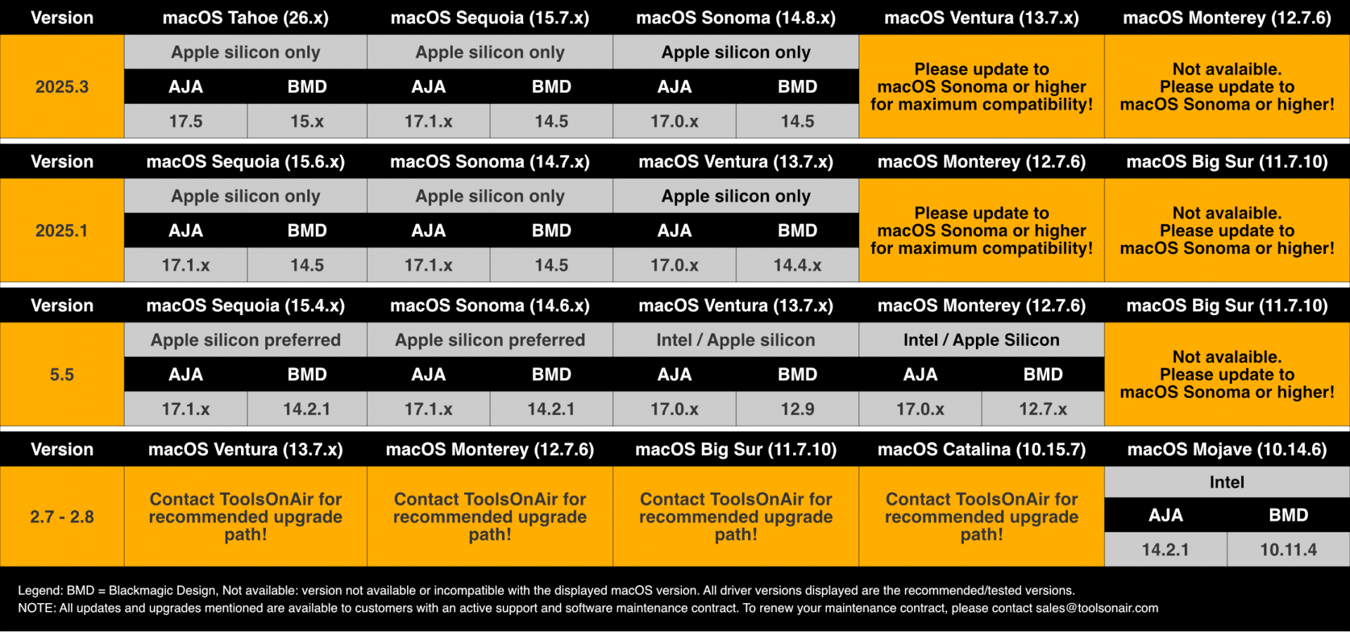 *Legend: 26.x = macOS Tahoe, 15.7.x = macOS Sequoia, 14.8.x = macOS Sonoma. macOS Sonoma and macOS Sequoia are the recommended OS versions for daily operations!