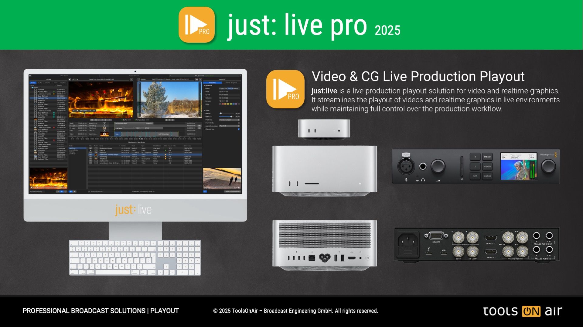 just:live pro 2025 is a macOS-based client-server live production playout solution for video and real-time graphics. It streamlines the playout of videos and graphics in any live environment, supporting SD, HD, and UHD formats as well as SDI, NDI®, SRT, UDP, and ST-2110 live input/output. With full control over the live production workflow and multi-control functionality, it is the ideal solution for professional studio operations.