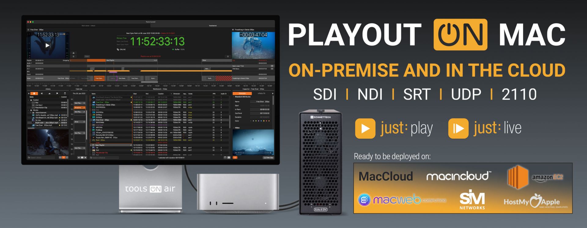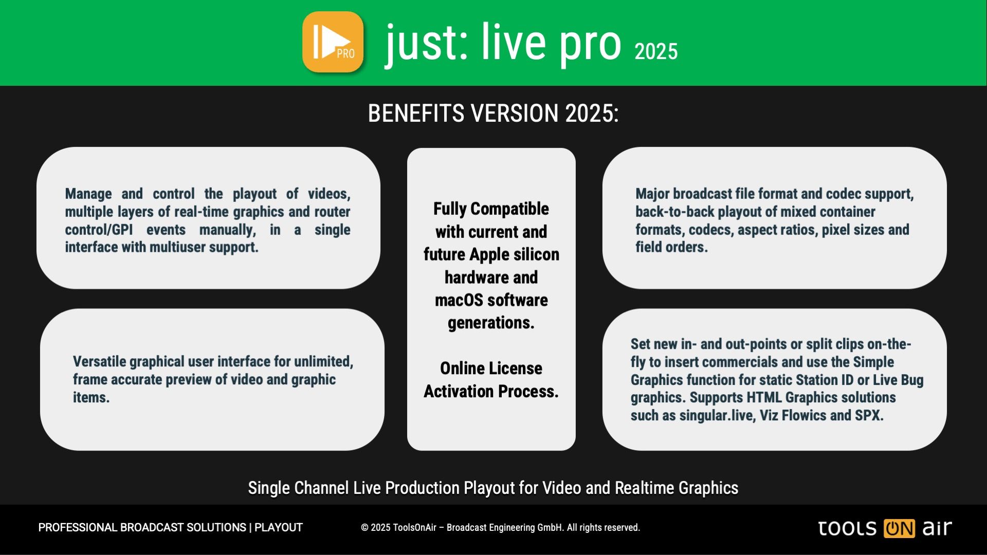 **Please verify that the available Media Engines in all Apple silicon based models meet your recording requirements, before buying a just:live pro 2025 license. You can test the full feature enabled just:live pro 2025 application for free by downloading the trial version from the related solution page. The trial version will add a ToolsOnAir watermark to the recordings. By licensing just:live pro 2025 the watermark will automatically be removed. All supported Mac models: min. of 16 GB of RAM highly recommended!
