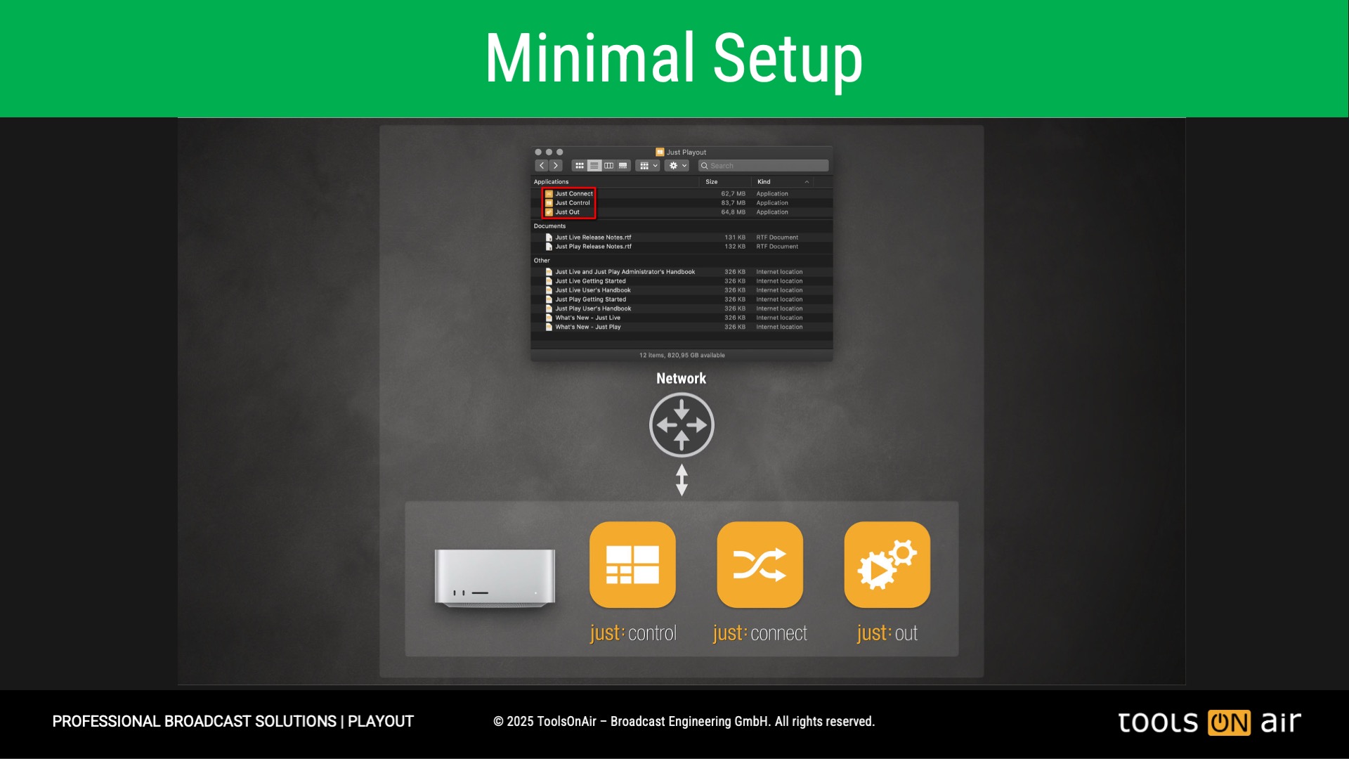 All core components—Just Out, Just Connect, and Just Control—can be installed on one machine, or distributed across multiple Macs to meet your exact needs.