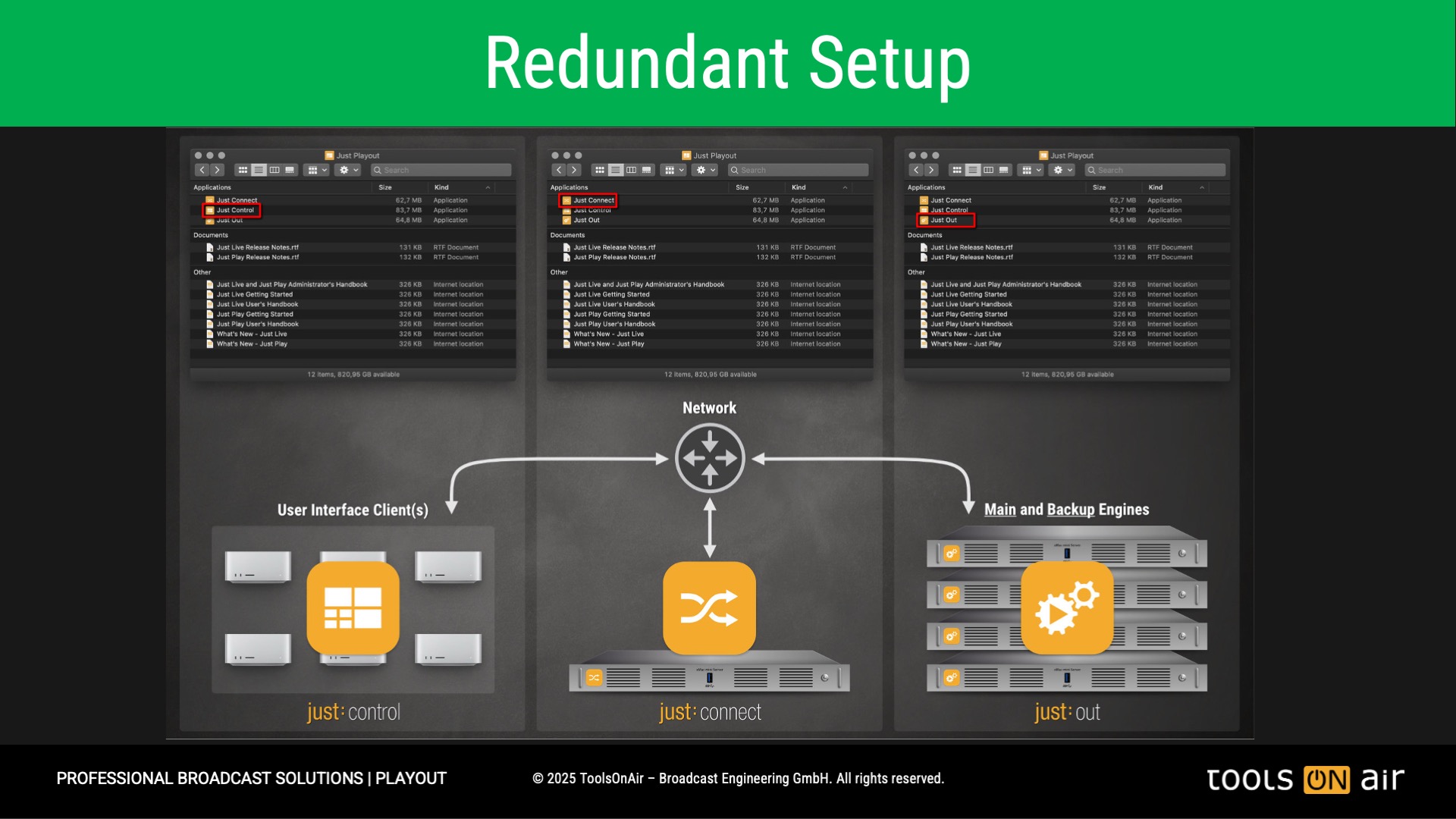 While it is possible to install Just Out, Just Connect and Just Control on a single machine, there's also the possibility to distribute the playout components to multiple machines. This chapter covers different setup variants.