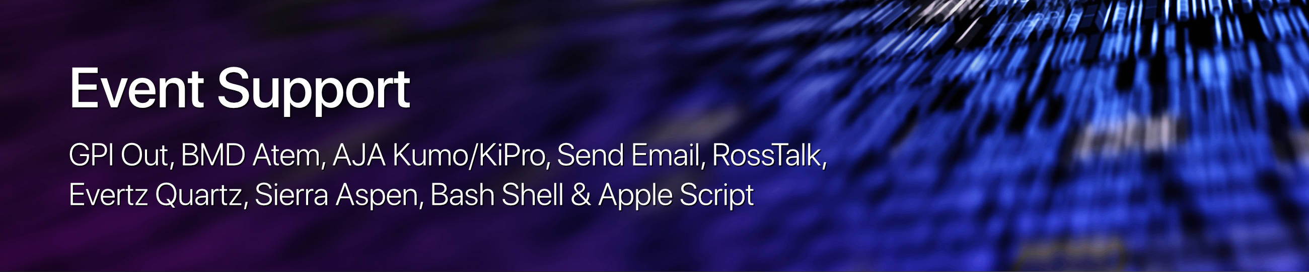- Event Support: GPI Out, BMD Atem, AJA Kumo/KiPro, Send Email, RossTalk, Evertz Quartz, Sierra Aspen, Bash Shell & Apple Script