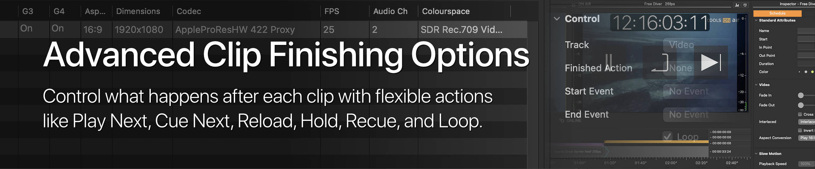 - Advanced Finished Actions for each clip, including Play Next, Cue Next, Reload, Hold, Recue and Loop.