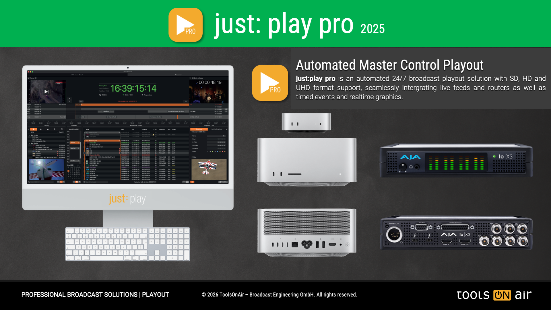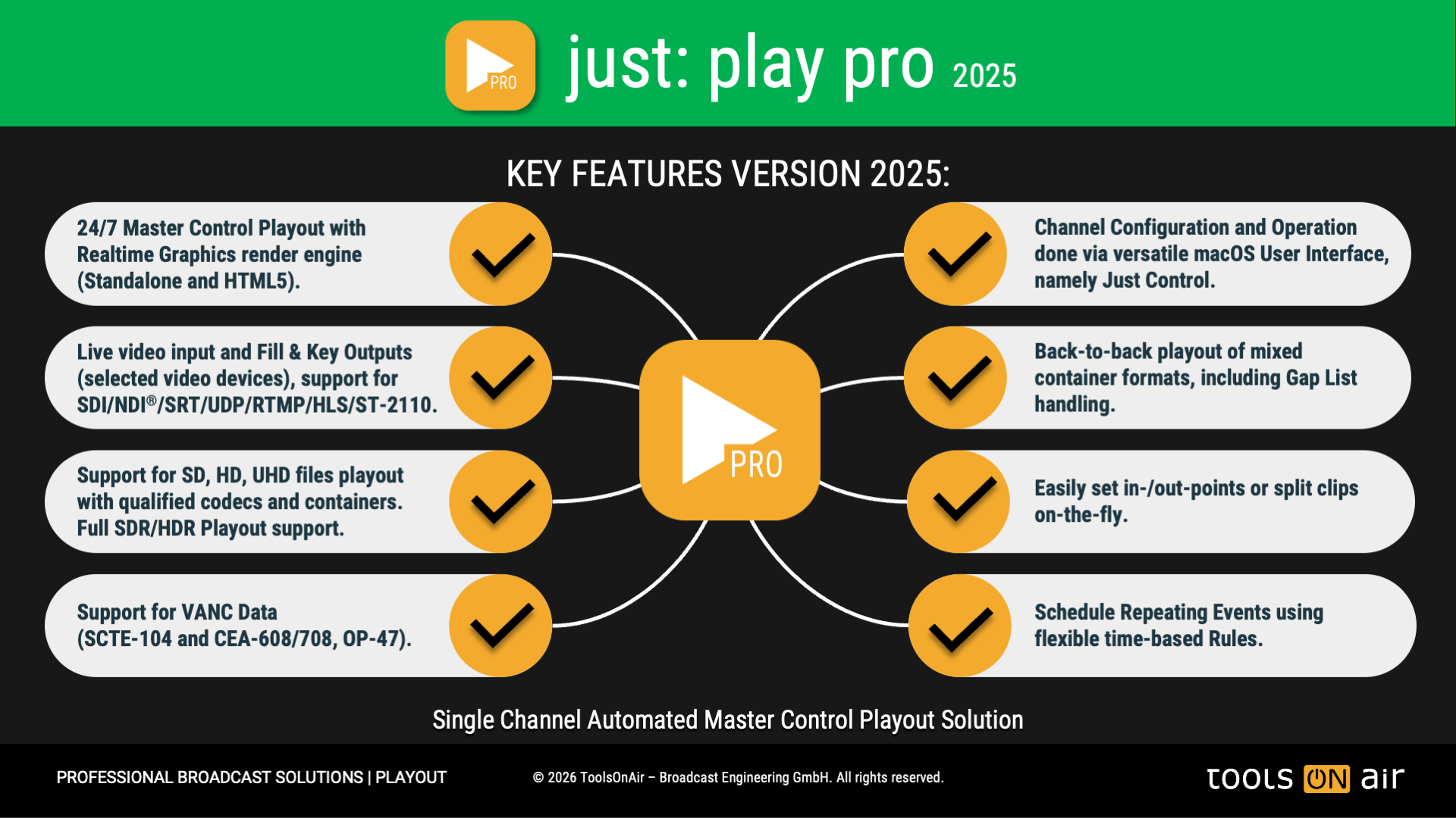 just:play pro 2025 is a single channel Client-Server based Master Control Playout solution with SD, HD, UHD format and SDI, NDI® High Bandwidth, SRT, UDP, ST-2110 Live Input/Output support, seamlessly integrating live feeds and routers as well as all kinds of events and static/animated realtime graphics.
