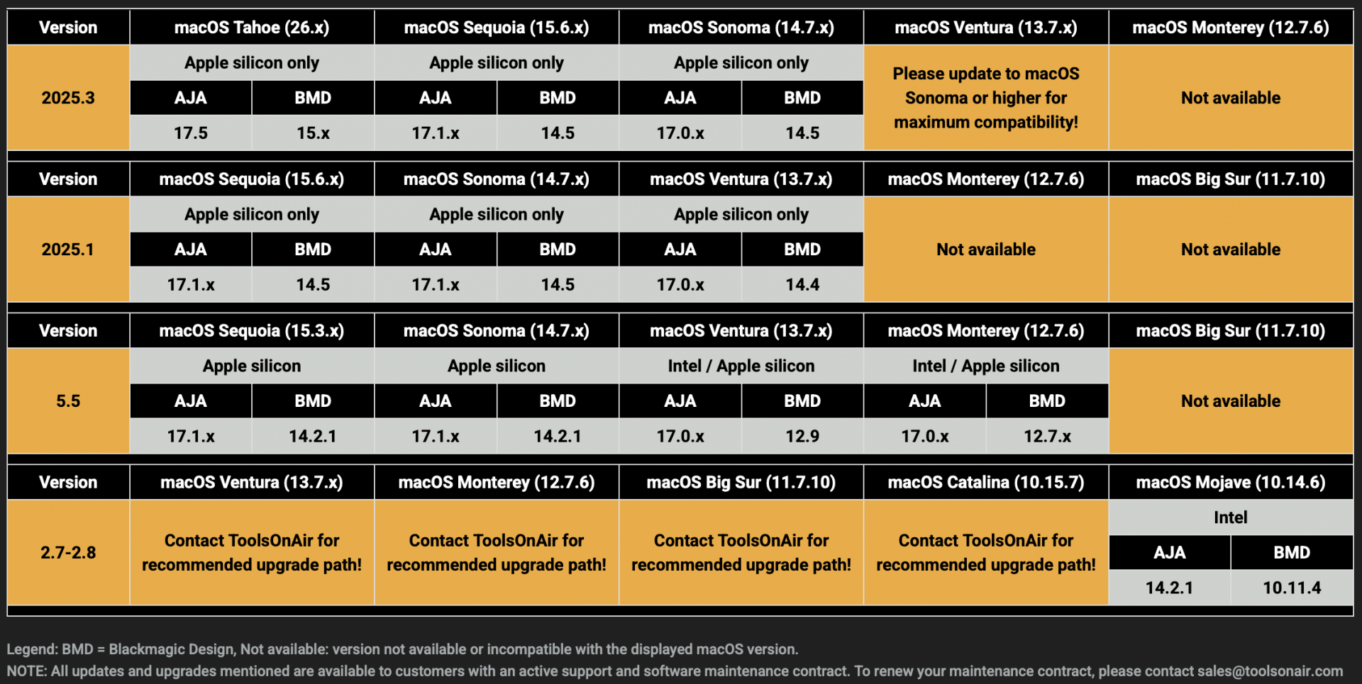 *Legend: 26.x = macOS Tahoe, 15.6.x = macOS Sequoia, 14.7.x = macOS Sonoma. macOS Sonoma and macOS Sequoia are the recommended OS versions for daily operations!