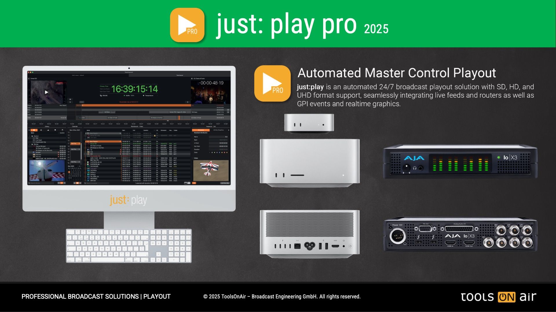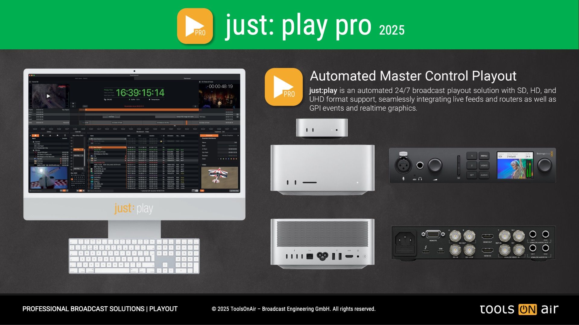 just:play pro 2025 is a single channel Client-Server based Master Control Playout solution with SD, HD, UHD format and SDI, NDI®, SRT, UDP, ST-2110 Live Input/Output support, seamlessly integrating live feeds and routers as well as all kinds of events and static/animated realtime graphics.
