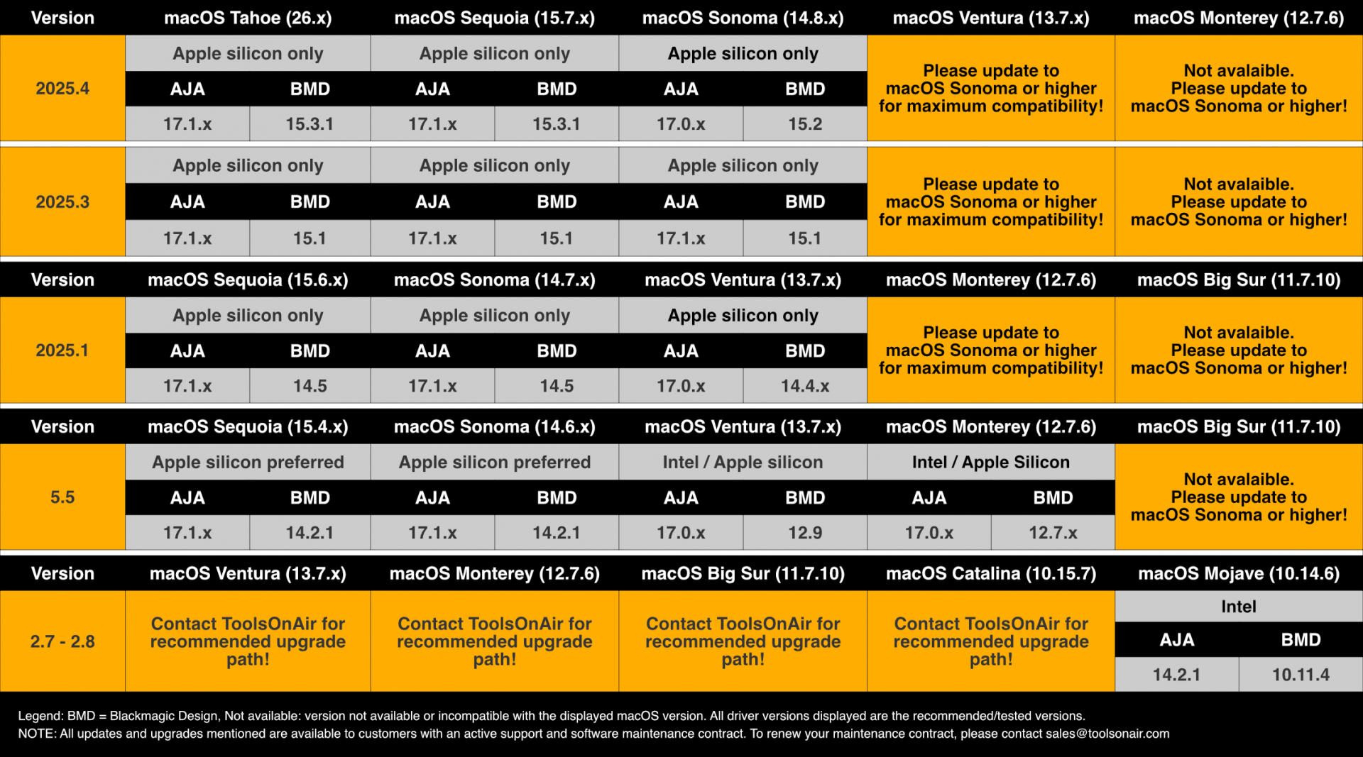 *Legend: 26.x = macOS Tahoe, 15.7.x = macOS Sequoia. macOS Sequoia is the recommended OS version for daily operations!