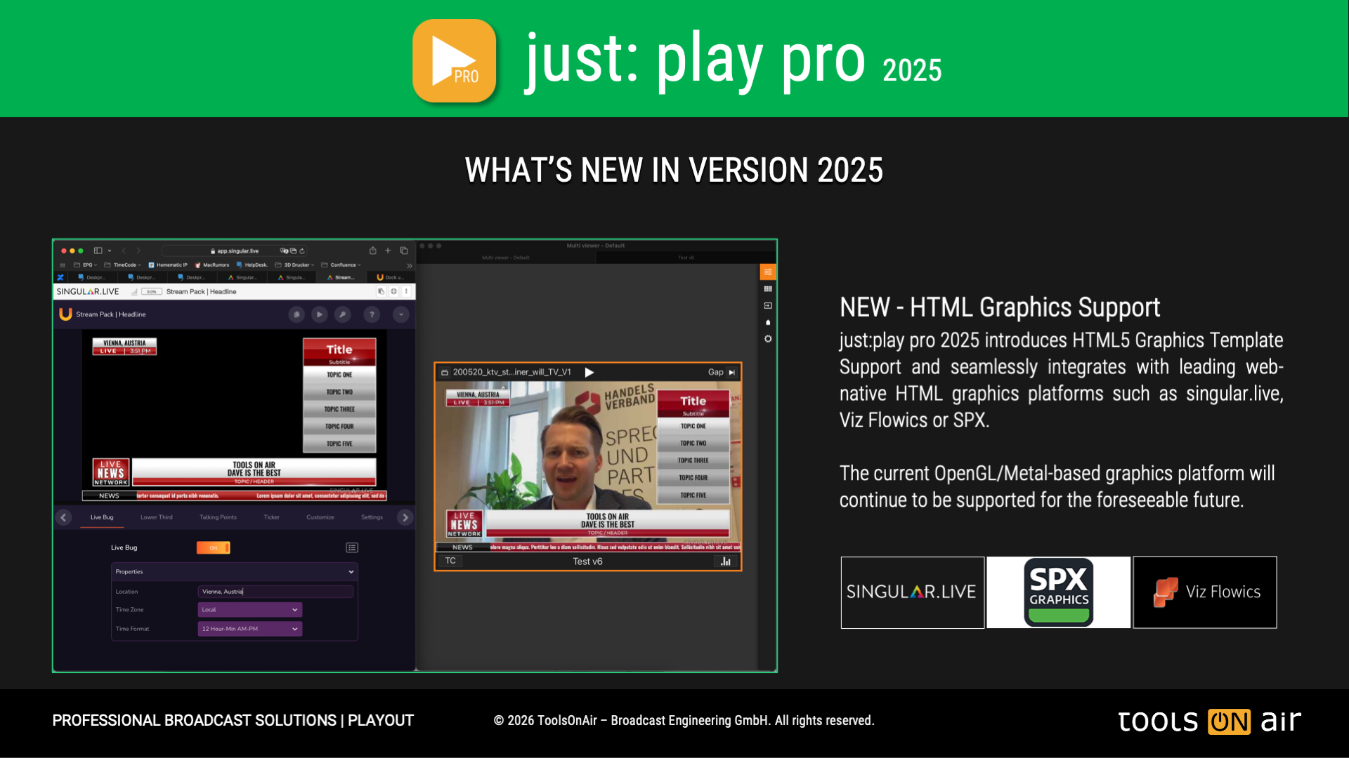 - Composition Builder - Tool to create realtime CG templates that can be scheduled over the just:play pro 2025 UI